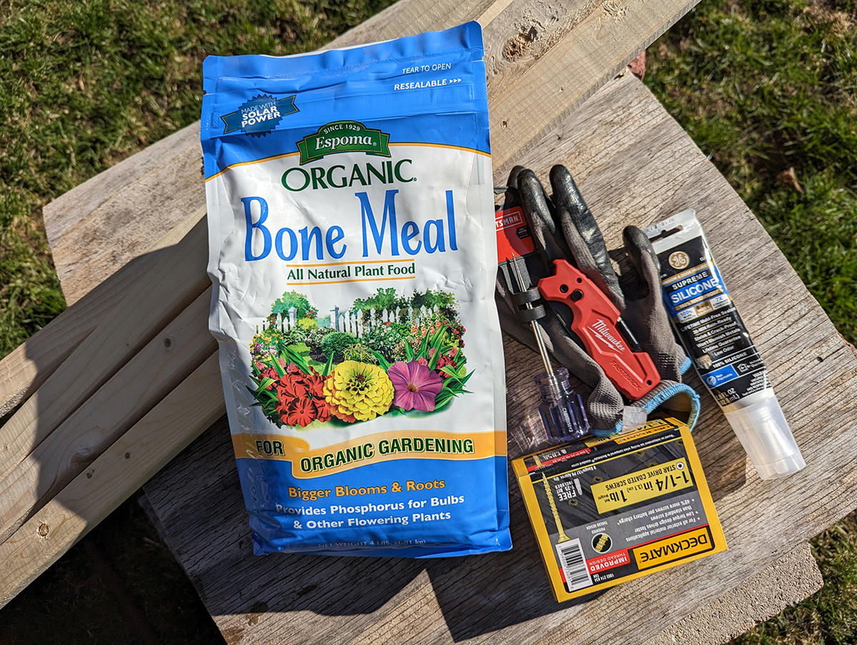 around 4pm i made a quick trip to home depot to return the unused drywall screws and get some 1-1/4" deck screws instead. i also got a tube of clear silicone (wasn't sure if i still had any left) and a bag of bone meal.