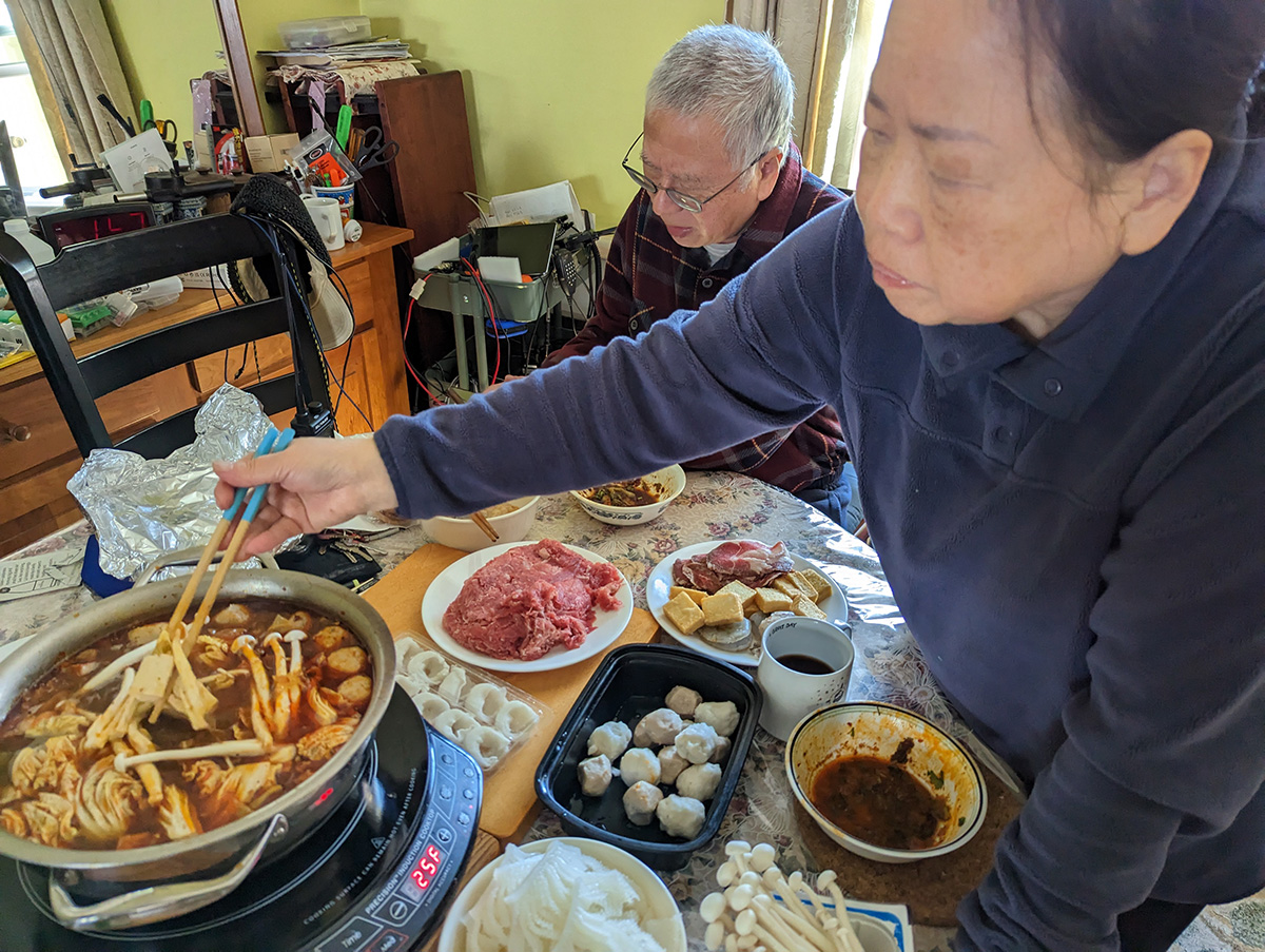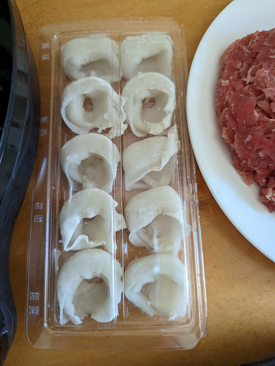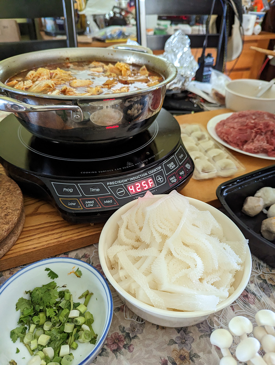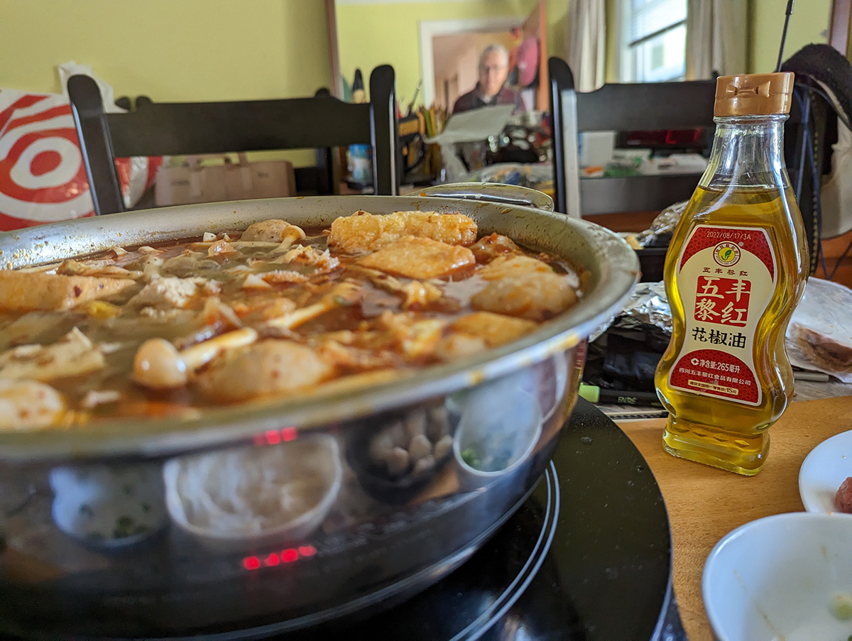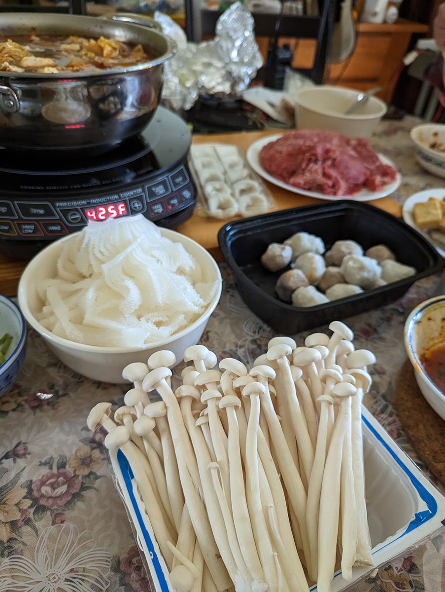 we stopped at the cafe to drop off the supplies, before returning to belmont. my parents reheated the leftover hot pot from last night for lunch, adding some additional ingredients we got from chinatown earlier like tripe, fresh enoki mushrooms, and shrimp dumplings. i got a bottle of peppercorn oil, added it to my dipping sauce for a super intense flavor. peppercorn oil is our new favorite condiment. we only had a bit of leftover lamb, but plenty of beef. however it was store-bought shaved steak, and was shredded so much that the meat would disintegrate once in the hot pot. the only way to cook it was to hold the beef in a mesh spoon.