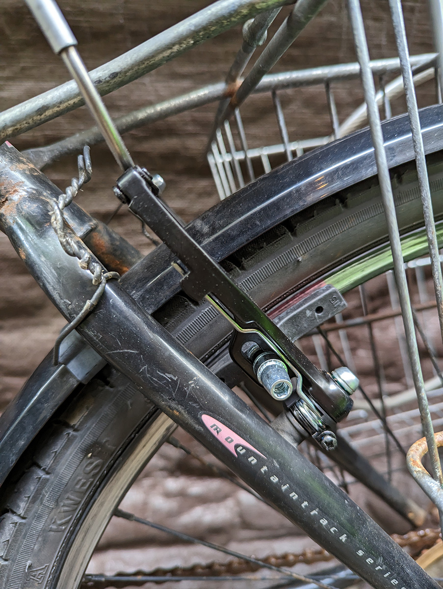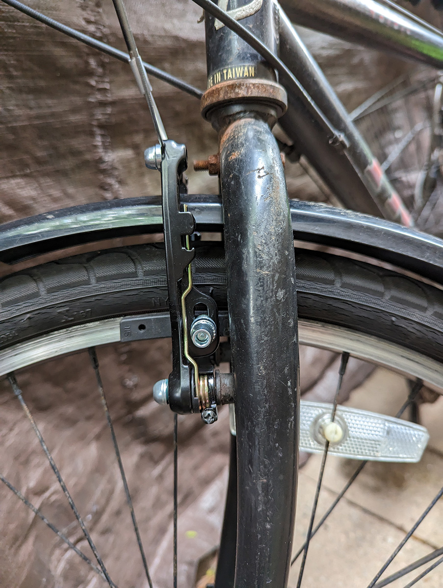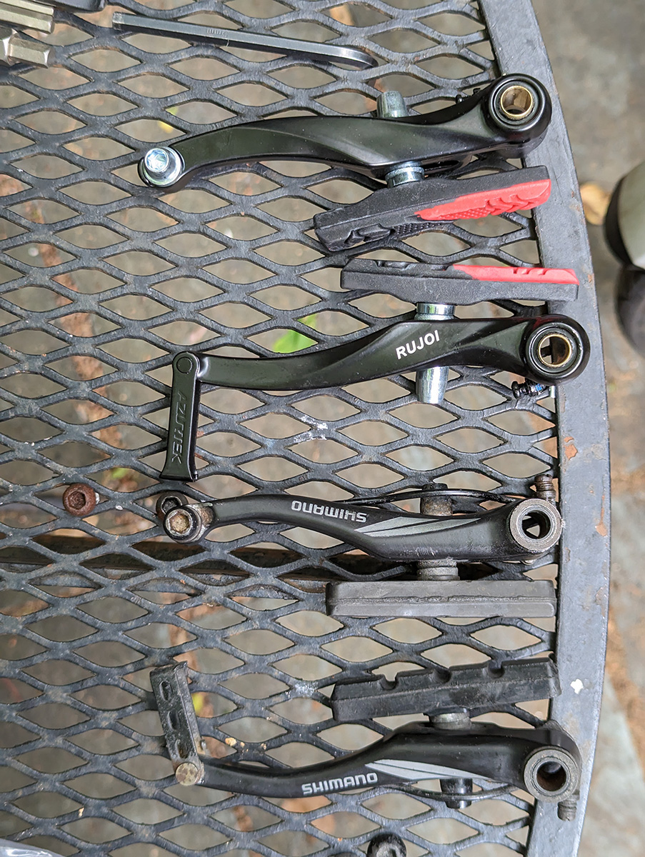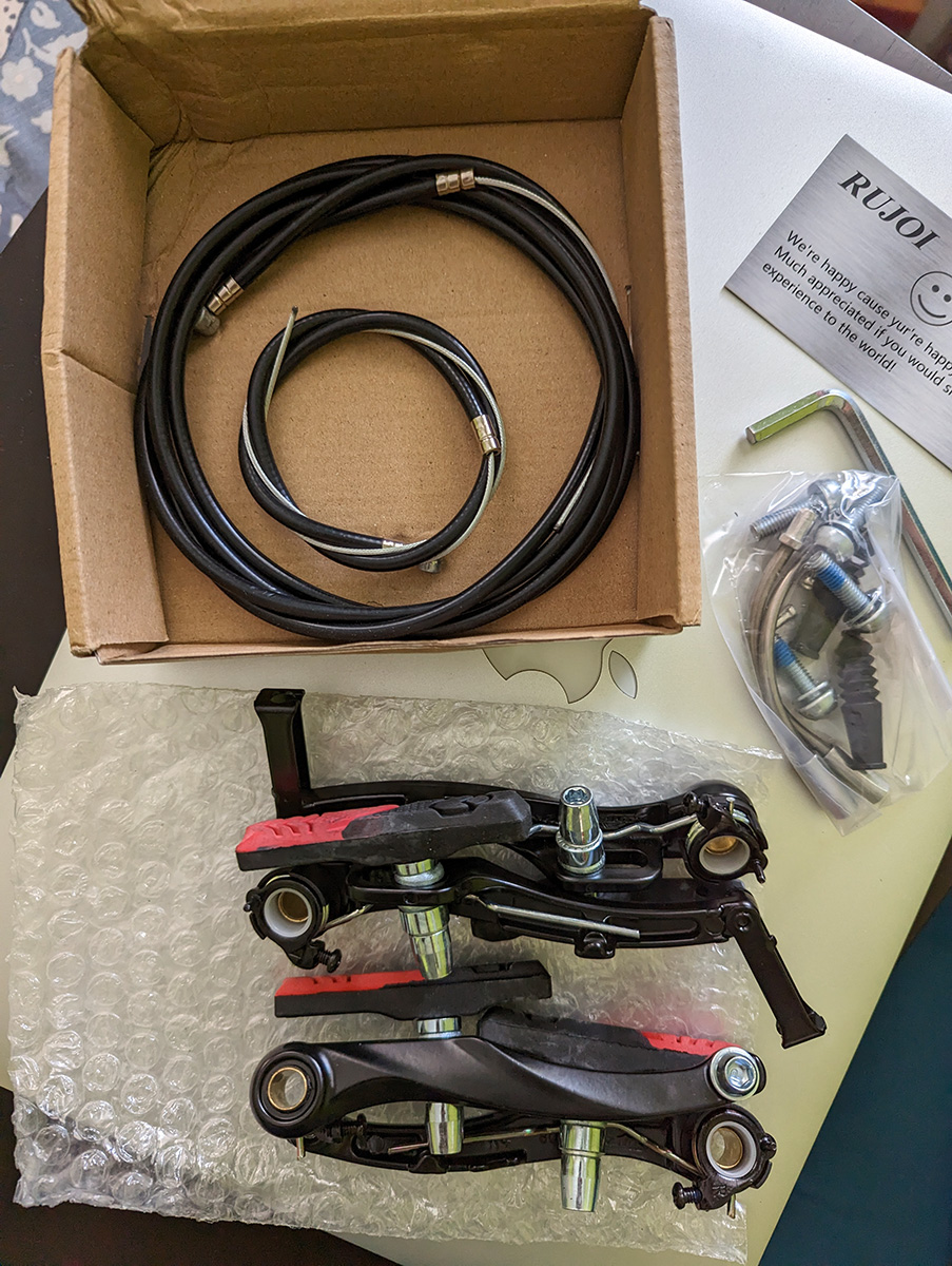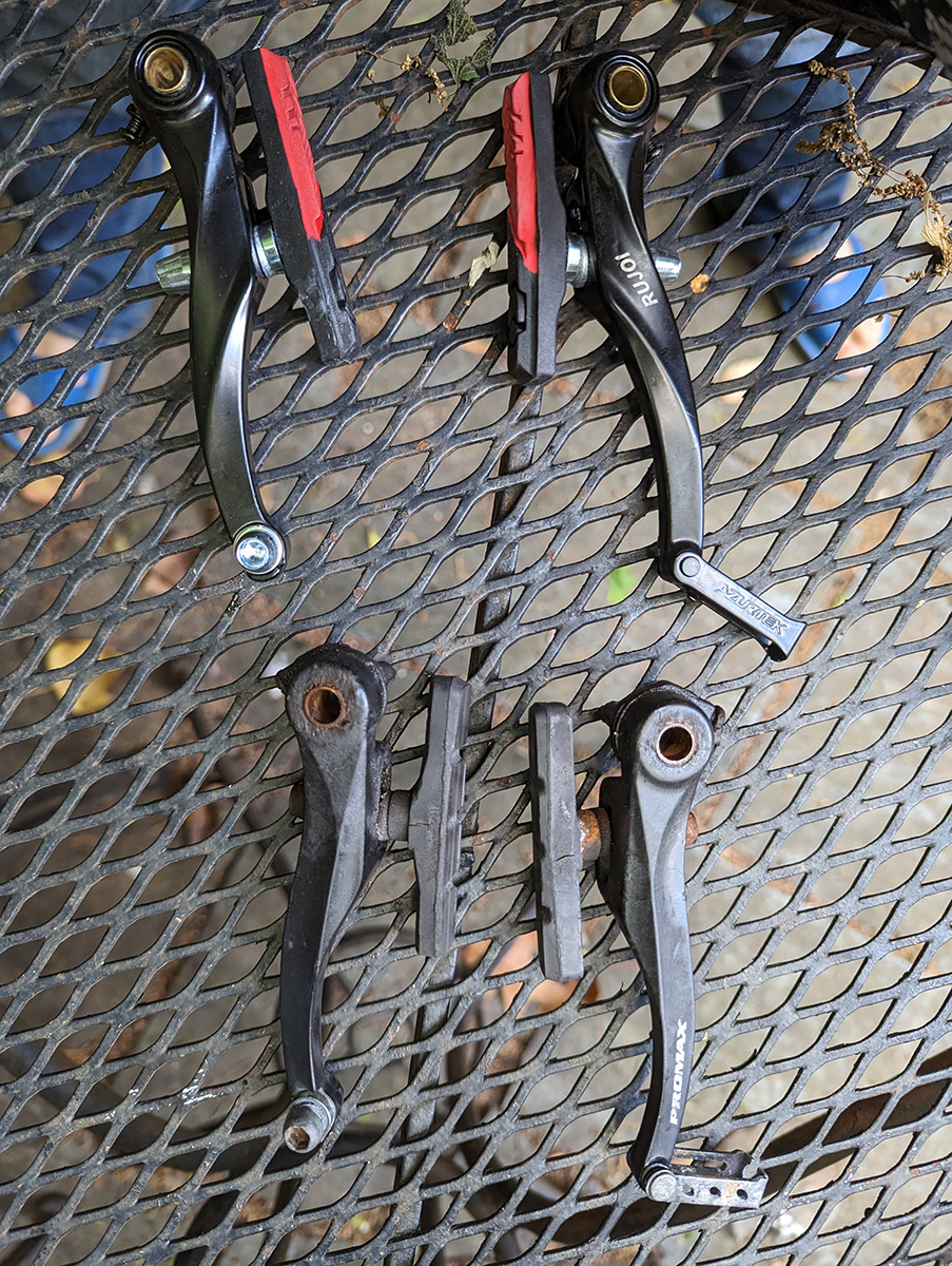 my replacement bike brakes arrived yesterday (RUJOI brand, $13 for 2 pairs). i got those because they came with the brake cables and housing, which i needed to replace as well. i did the front brakes first, since they're the most important, and most in need of replacement. from my records, it looked like i replaced the front brakes back in april 2019 (PROMAX brand), so more than 4 years ago. since that time i've replaced the brake pads at least once a year, but the brake arms have finally worn out, rusted so badly they won't spring back anymore. i was having a hard time removing the old brakes, so i removed the front wheel to give me working room. i sprayed the brake assemblies with WD-40 and tried using a hammer to knock them out. what finally ended up working was just pulling and twisting on the brakes repeatedly until they finally came off.
