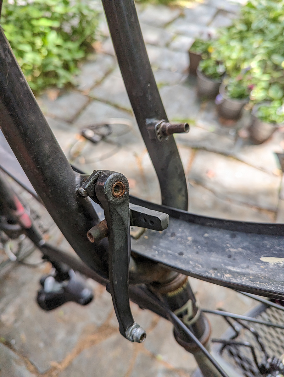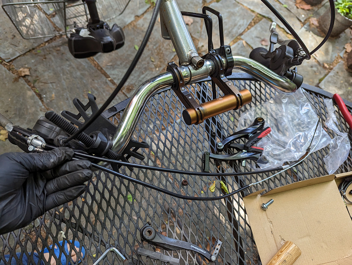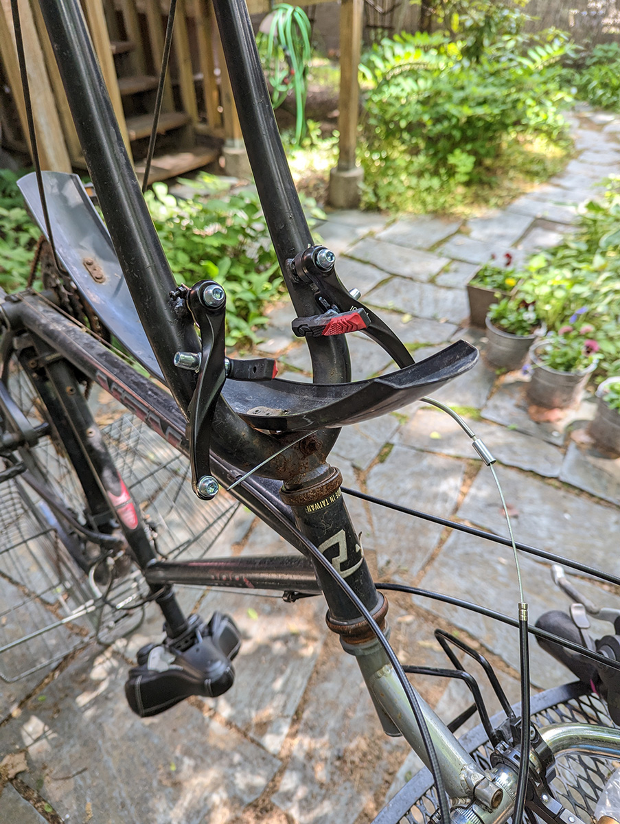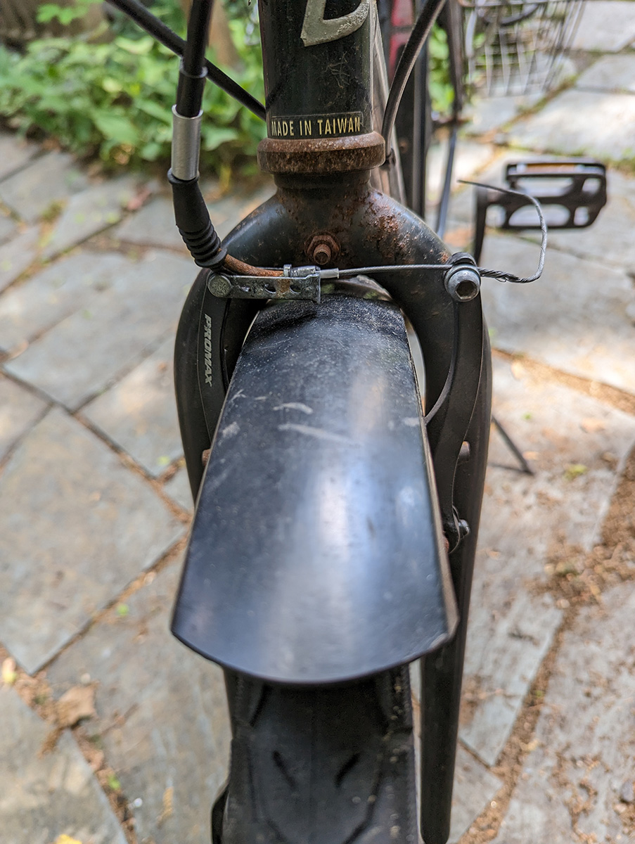 my replacement bike brakes arrived yesterday (RUJOI brand, $13 for 2 pairs). i got those because they came with the brake cables and housing, which i needed to replace as well. i did the front brakes first, since they're the most important, and most in need of replacement. from my records, it looked like i replaced the front brakes back in april 2019 (PROMAX brand), so more than 4 years ago. since that time i've replaced the brake pads at least once a year, but the brake arms have finally worn out, rusted so badly they won't spring back anymore. i was having a hard time removing the old brakes, so i removed the front wheel to give me working room. i sprayed the brake assemblies with WD-40 and tried using a hammer to knock them out. what finally ended up working was just pulling and twisting on the brakes repeatedly until they finally came off.