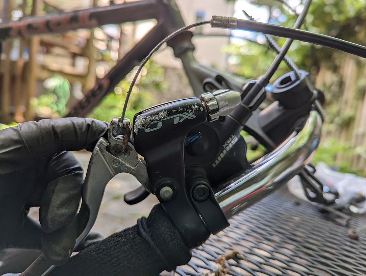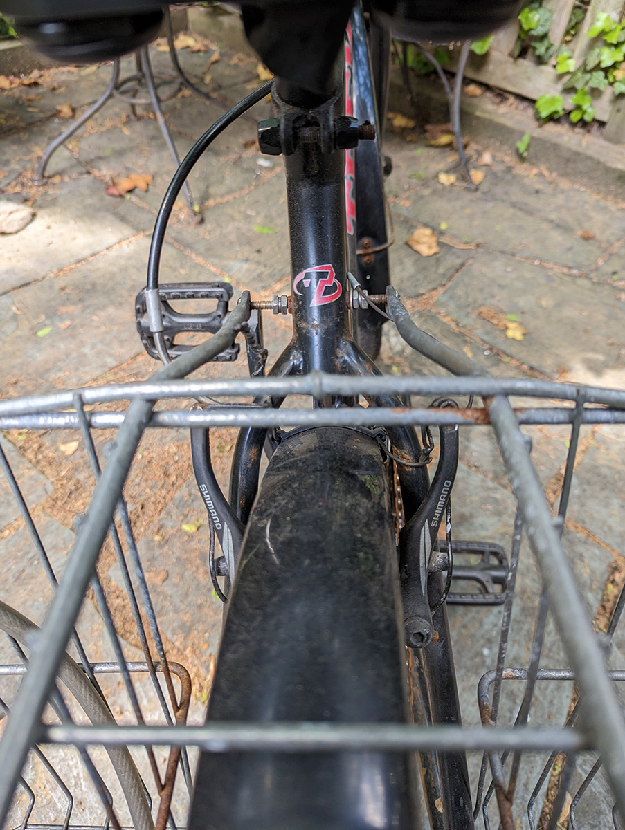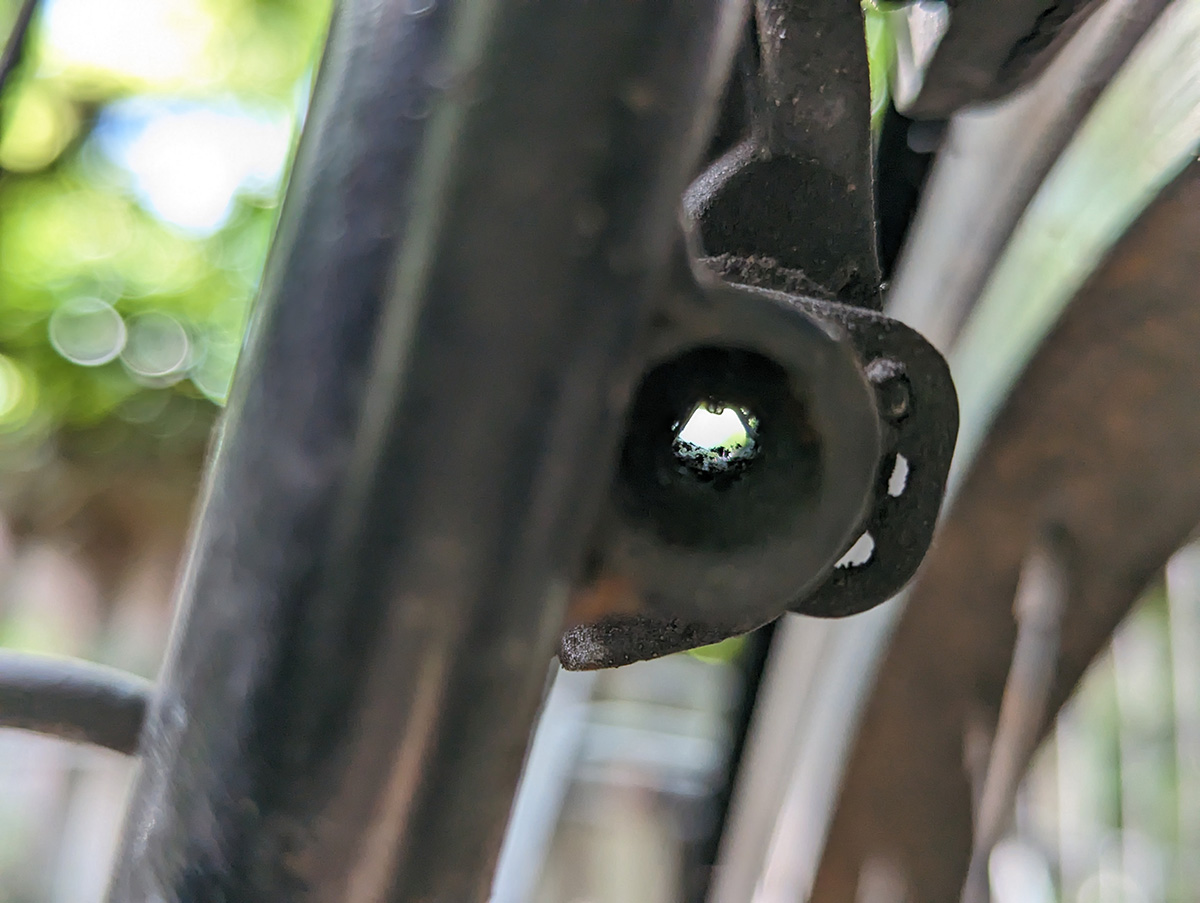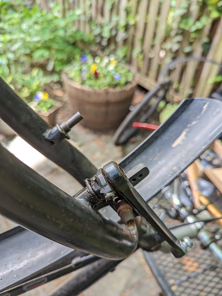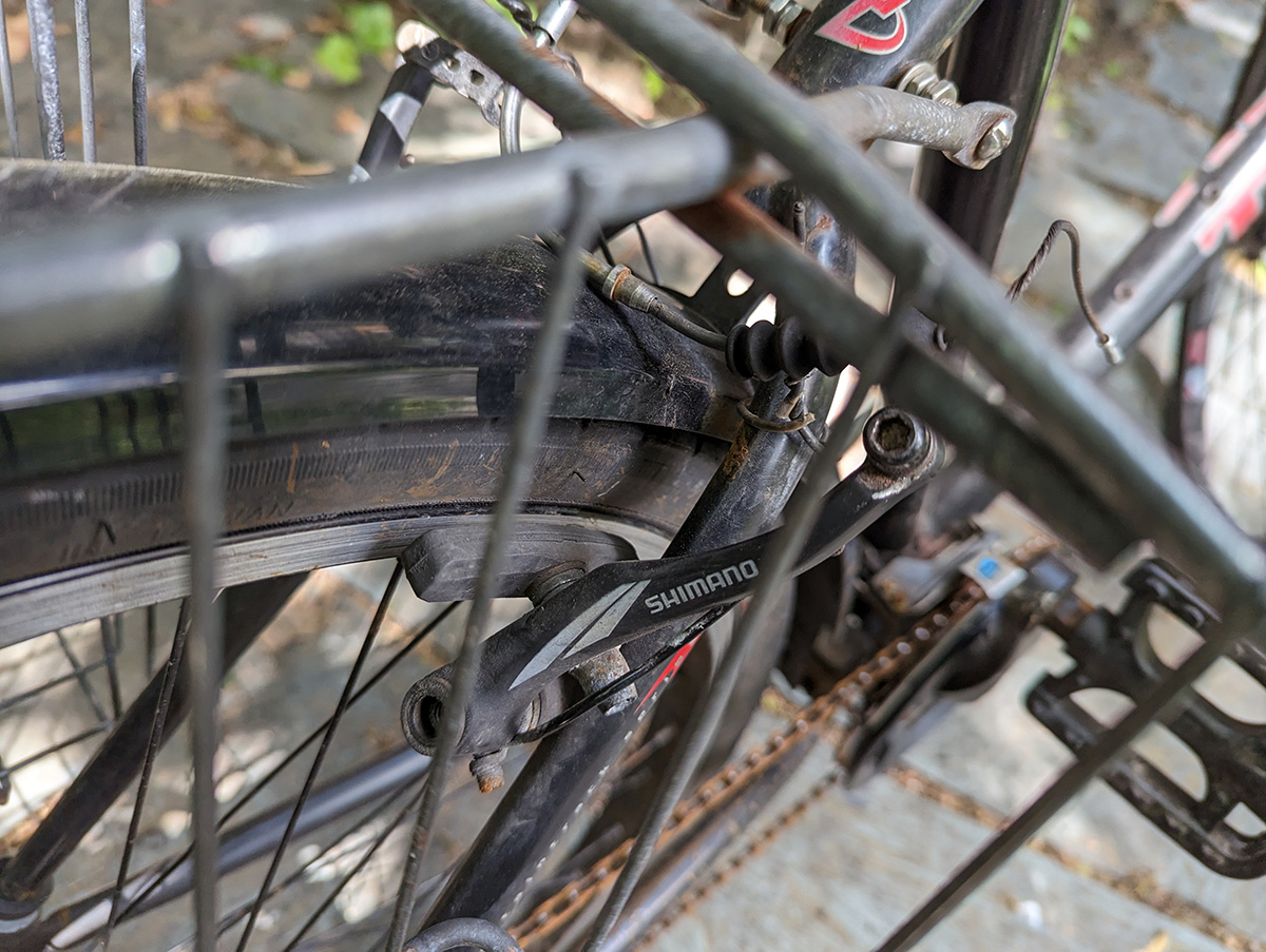 my replacement bike brakes arrived yesterday (RUJOI brand, $13 for 2 pairs). i got those because they came with the brake cables and housing, which i needed to replace as well. i did the front brakes first, since they're the most important, and most in need of replacement. from my records, it looked like i replaced the front brakes back in april 2019 (PROMAX brand), so more than 4 years ago. since that time i've replaced the brake pads at least once a year, but the brake arms have finally worn out, rusted so badly they won't spring back anymore. i was having a hard time removing the old brakes, so i removed the front wheel to give me working room. i sprayed the brake assemblies with WD-40 and tried using a hammer to knock them out. what finally ended up working was just pulling and twisting on the brakes repeatedly until they finally came off.