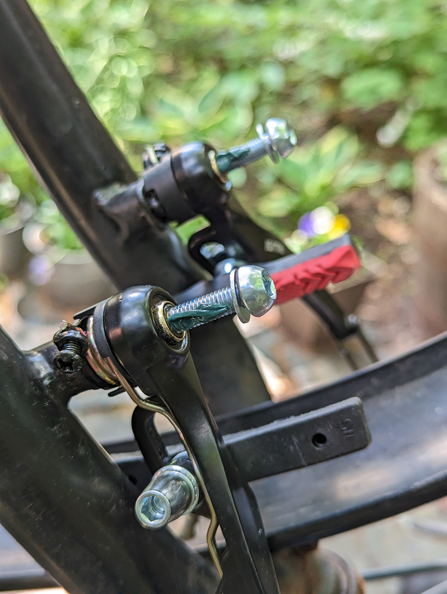 installing the new front brakes was easy. i put some grease on the brake pivots, so they'd be easier to remove when i needed to. for some reason these brakes used a non-standard size of 5.5mm for the fixing bolt and brake pad socket nuts. once the brakes were on, i replaced the front brake cable and housing. i haven't replaced any wires or housing in a while, but glad i still remembered how. the new cable and housing was 6in shorter than the one i had before. i thought about using the old housing, but decided against it, better to use the new one. i then spent some time adjusting the brake pads so it hit the rim equally. i played around with the adjustment screws but they didn't seem to make any difference. what finally did it was just to unseat the wheel and realign it slightly so it sat between the two brake pads.