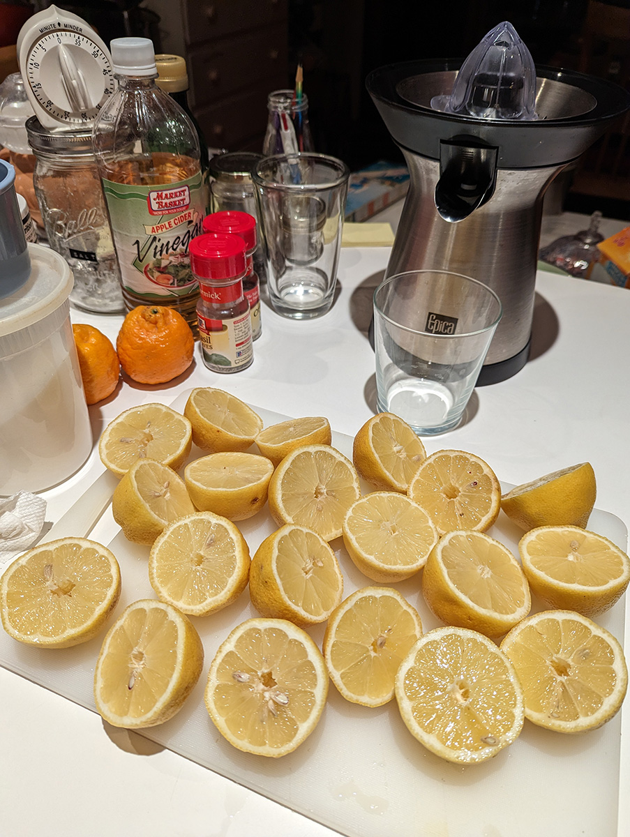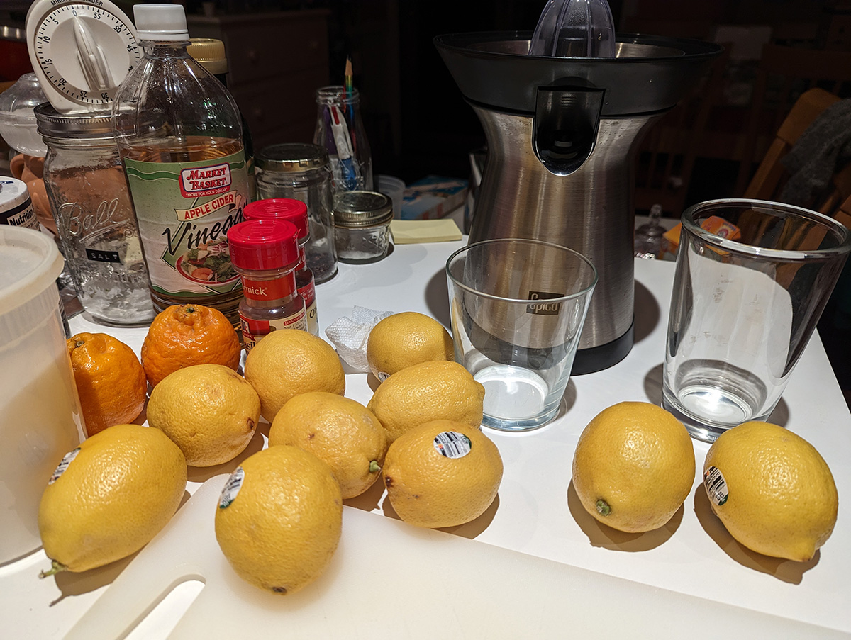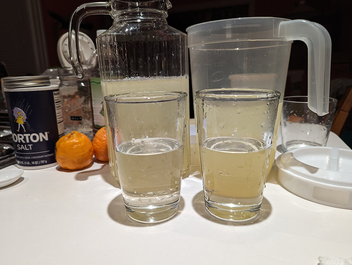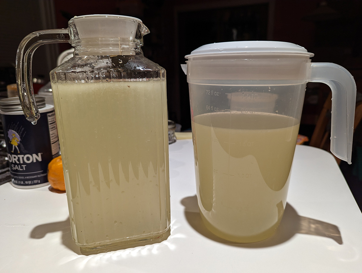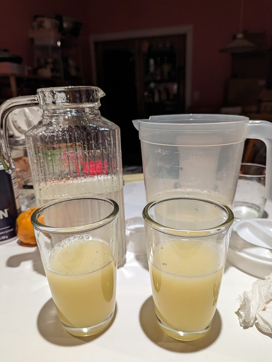 later in the evening i made some homemade lemonade with the 10 lemons i bought from haymarket two weeks ago. the recipe went much faster this time. using my juicer, i was able to extract 2-1/2 cups of lemon juice. i divided the juice into 2 portions, so i could make two pitchers of lemonade. i also made some sugar syrup - 1-3/4 cups of sugar heated with 1 cup of water. i had two 2 qt pitchers. i filled each one with 1qt of water (4 cups each). i then added roughly 1-1/2 cups of lemon juice to each pitcher. i divided the syrup, about a cup each. finally i added another 1 cup of water to each pitcher.