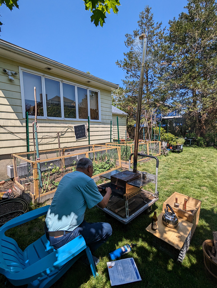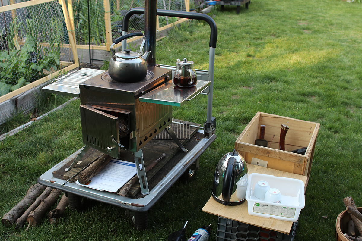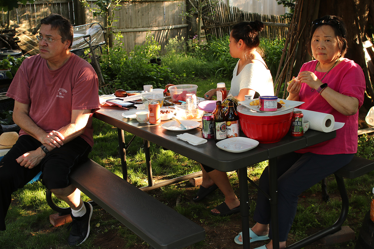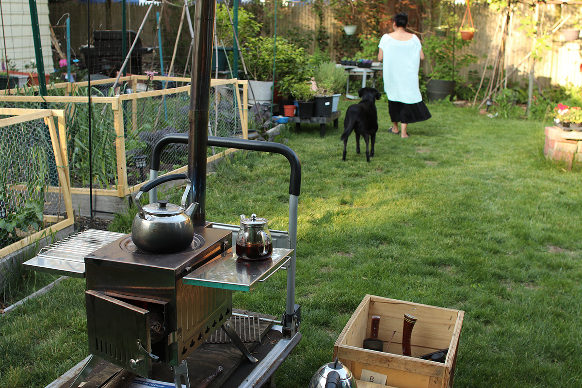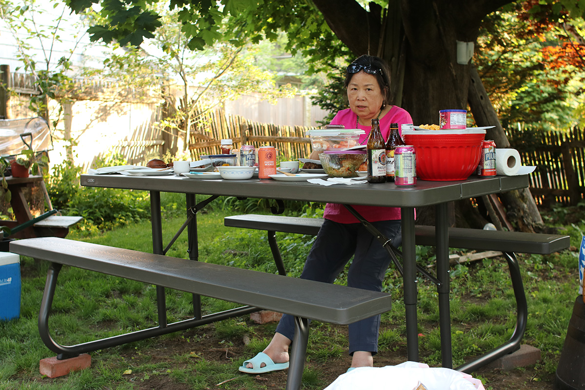 my father moved out his stainless steel camping stove and fired it up in the backyard underneath the shade of the maple tree. later he burned some wood matthew gave him and something smelled really nice, either hawthorn or spruce, but it had a fragrance reminiscent of chinese temple incense (my guess is the spruce). we took the collapsible picnic table from the garage and set it up in the backyard underneath the maple tree as well. this was actually our first time using this table after getting it last year.