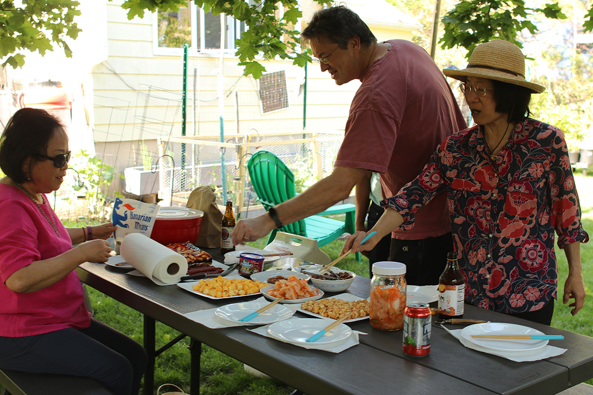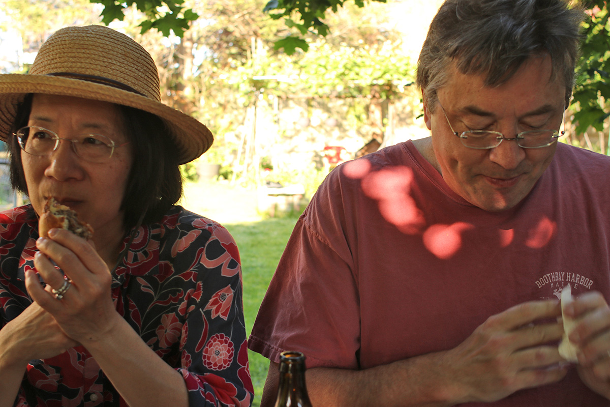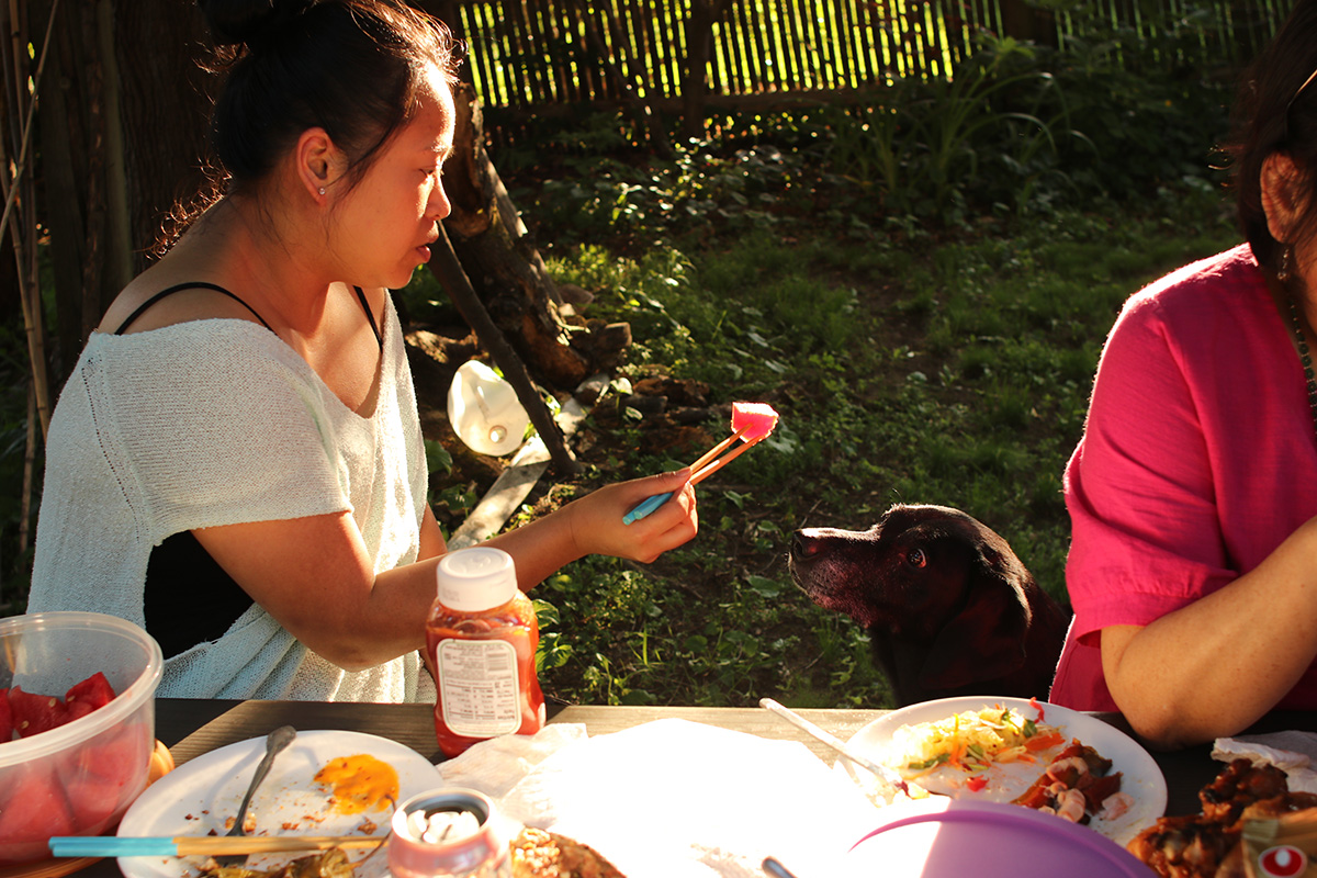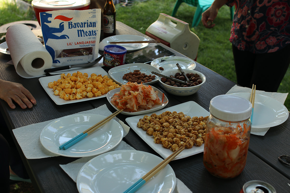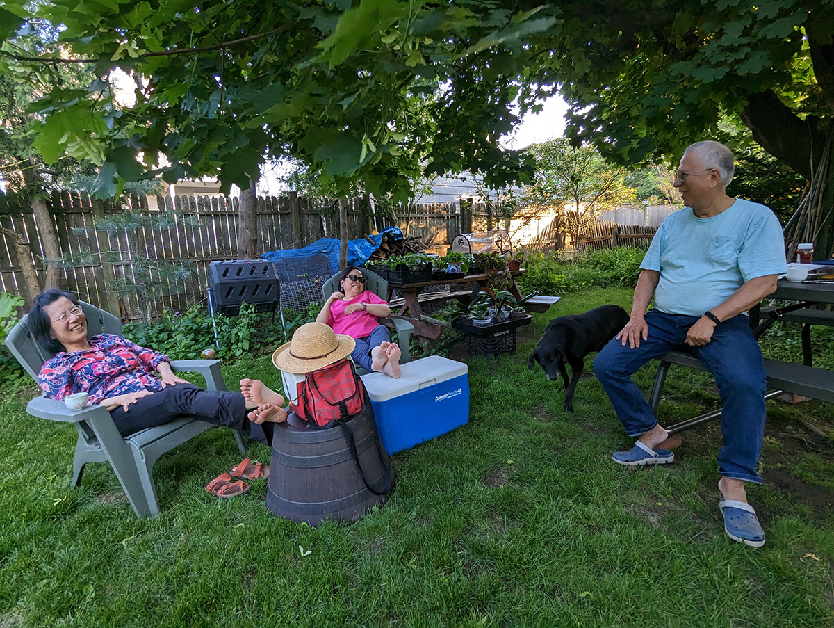 my father moved out his stainless steel camping stove and fired it up in the backyard underneath the shade of the maple tree. later he burned some wood matthew gave him and something smelled really nice, either hawthorn or spruce, but it had a fragrance reminiscent of chinese temple incense (my guess is the spruce). we took the collapsible picnic table from the garage and set it up in the backyard underneath the maple tree as well. this was actually our first time using this table after getting it last year.
