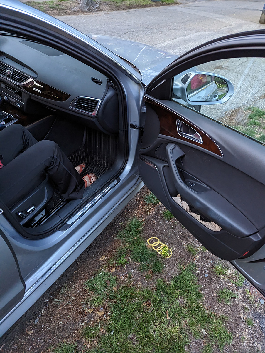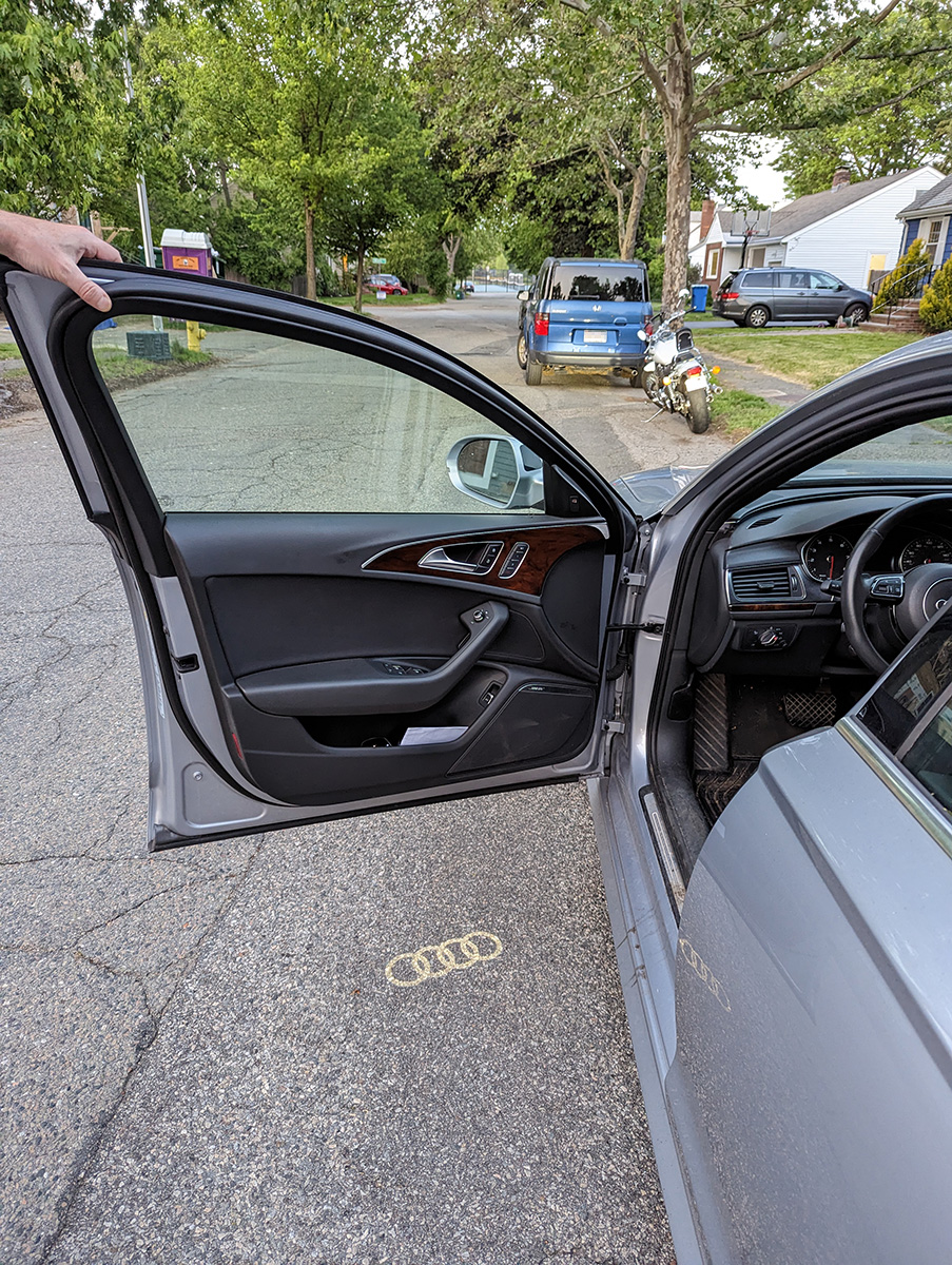 my aunt and uncle left after 8pm, after helping with the clean up by bringing everything into the kitchen. about to drive off, we noticed the special audi door lights. matthew was looking at our reseeded front lawn and suggested mixing the grass seeds with soil before broadcasting, for a more even distribution. he also said he'd drop off a dethatching rake.