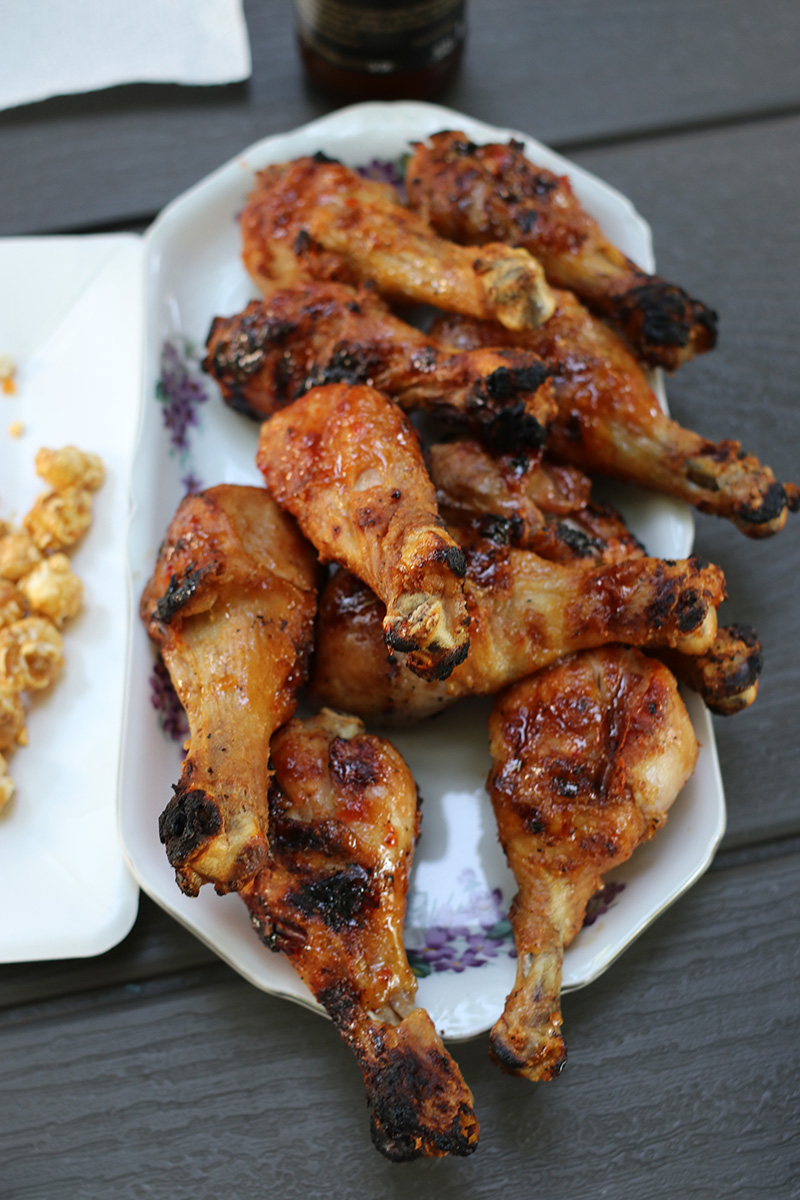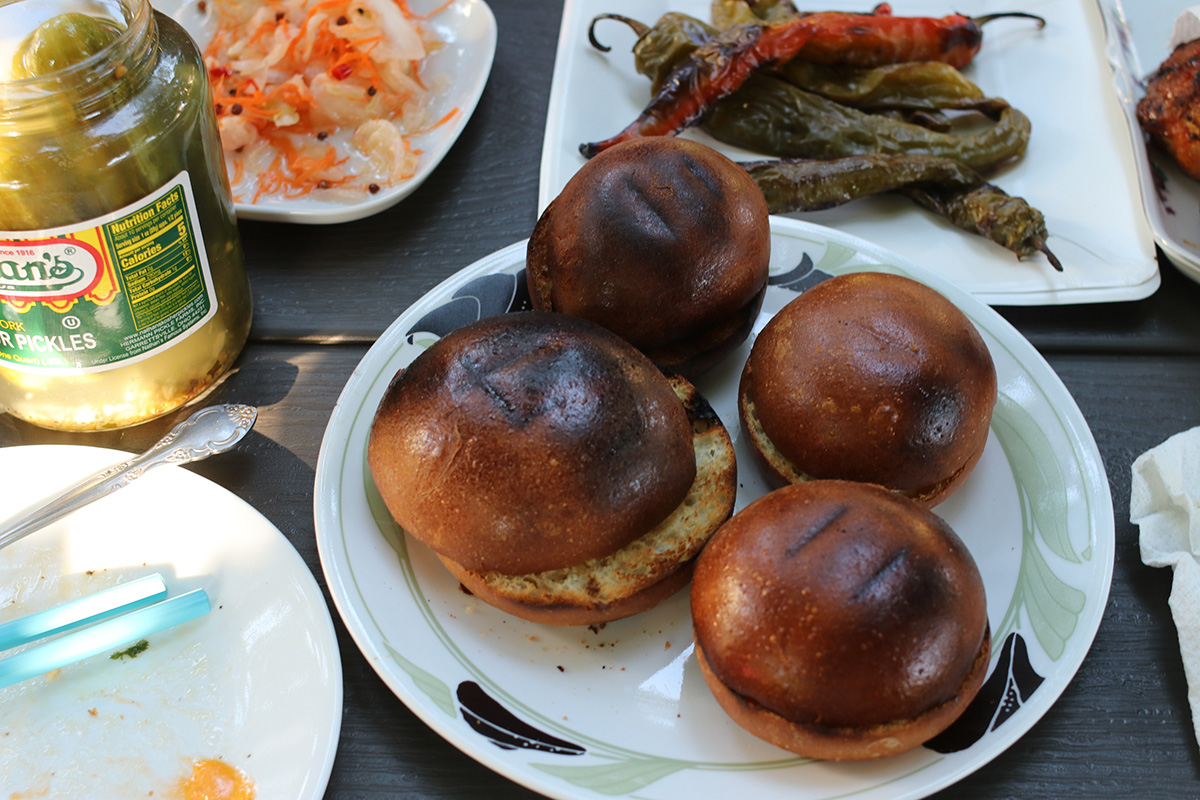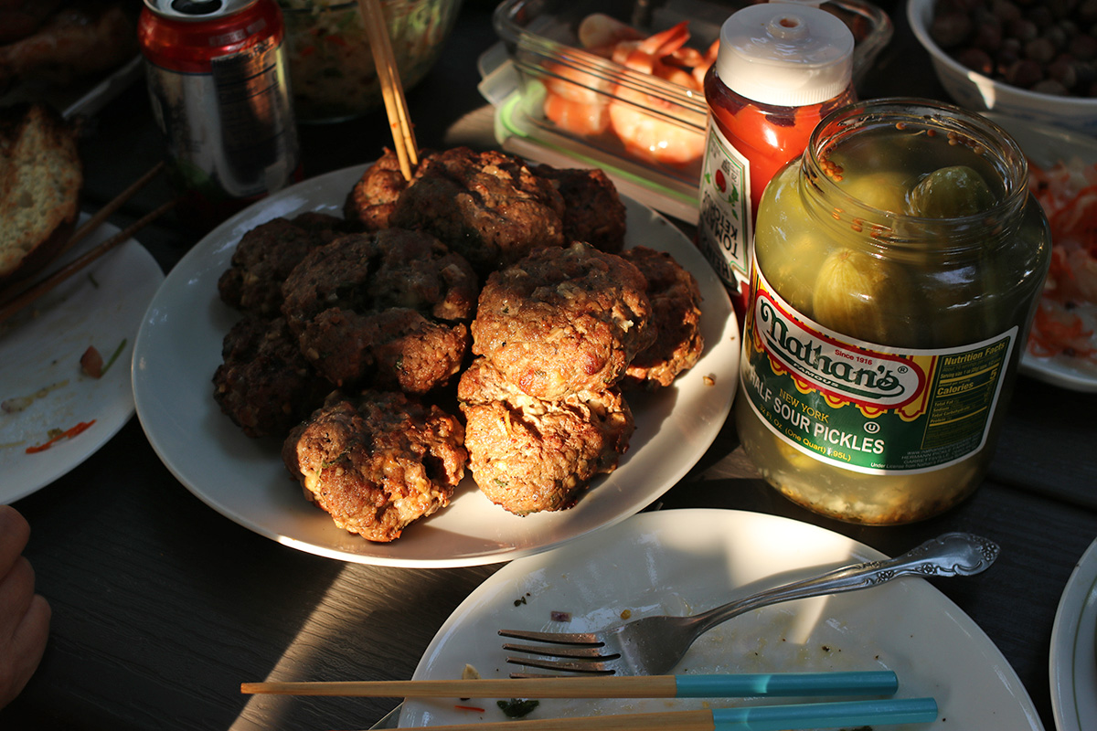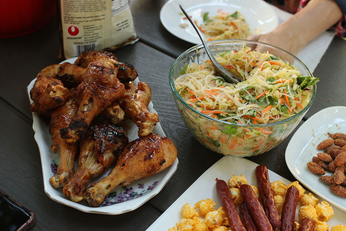 around 3:30pm we started grilling the first of our meats: 鹽酥雞 marinated drumsticks. my aunt and uncle arrived promptly at 4pm, right when the drumsticks were about to finish cooking. that was followed by italian sausages, then blue cheese burgers. my father was also prepared to make salt & pepper shrimps on the outdoor wok but by that point everyone was pretty full.