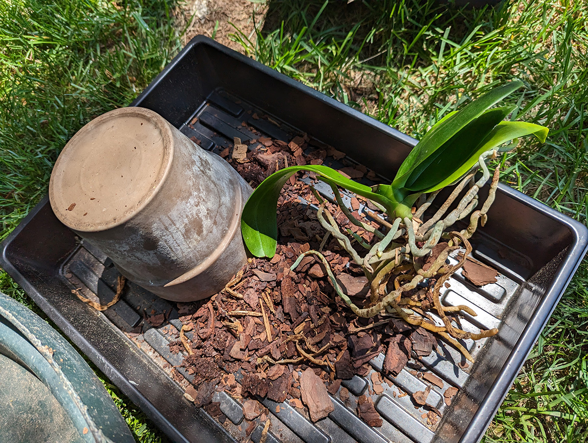 the day was gearing up to 4pm, when my aunt and uncle would come over for a memorial day weekend barbecue. my parents did not hold any barbecue events last year. seems like we were the only household having a barbecue today, the neighborhood was unusually quiet, like everyone else had left town for the weekend. the weather was pleasant - hot but dry (temperature in the 80's). my sister left hailey at home while she went back to her place to continue cleaning. my father earlier had moved all the remaining houseplants (mostly pileas) back outside. i contacte temu about returning a cracked clear orchid pot and they told me to keep it plus refund. the pot was still usable though, so i repotted our smallest orchid into this clear container.