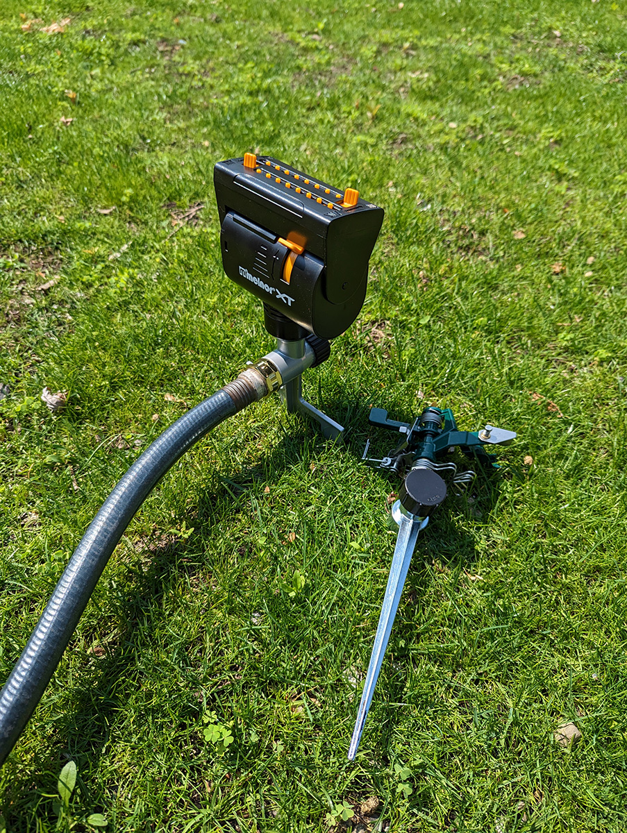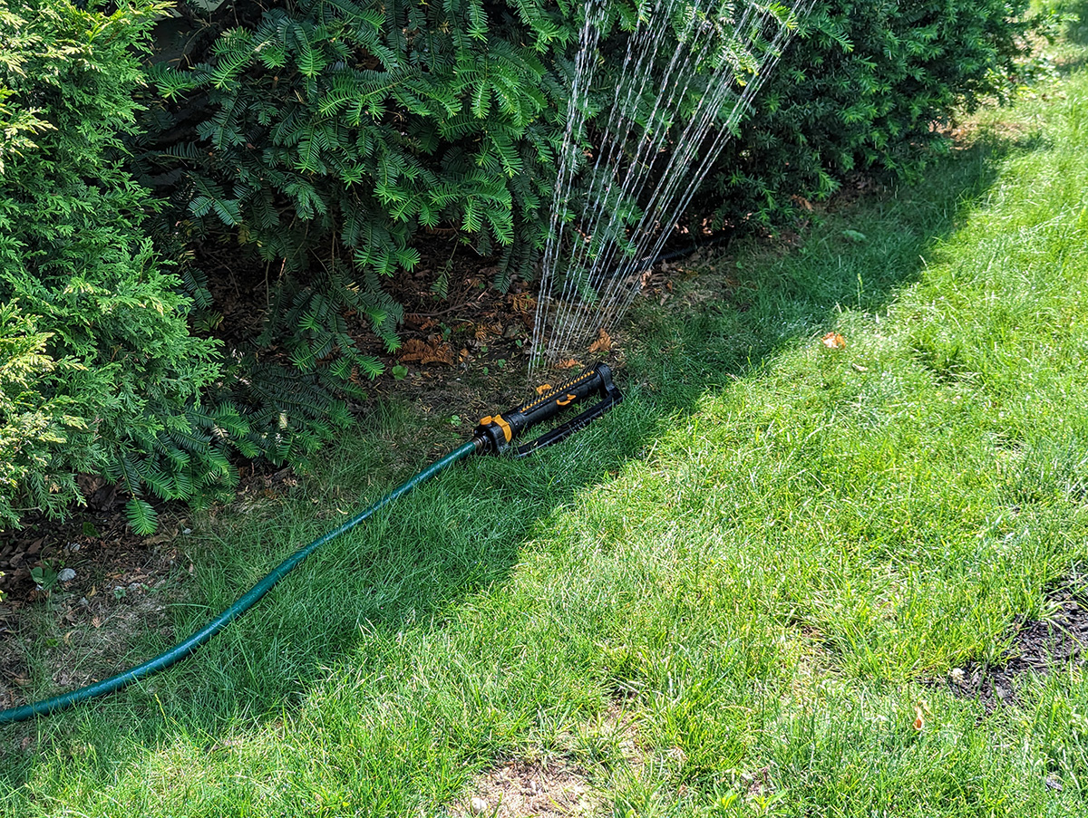 the melnor minimax turbo oscillating sprinker (with step spike) also arrived today ($27). what i liked about it is it has the same coverage as our melnor adjustable sprinkler, but in a more compact size and on a garden spike so it doesn't sit on any grass. i swapped out the pulsating sprinkler and replaced it with the minimax, positioned in the center of the old reseeded lawn for most efficient coverage. i then adjusted it so watered just that area.