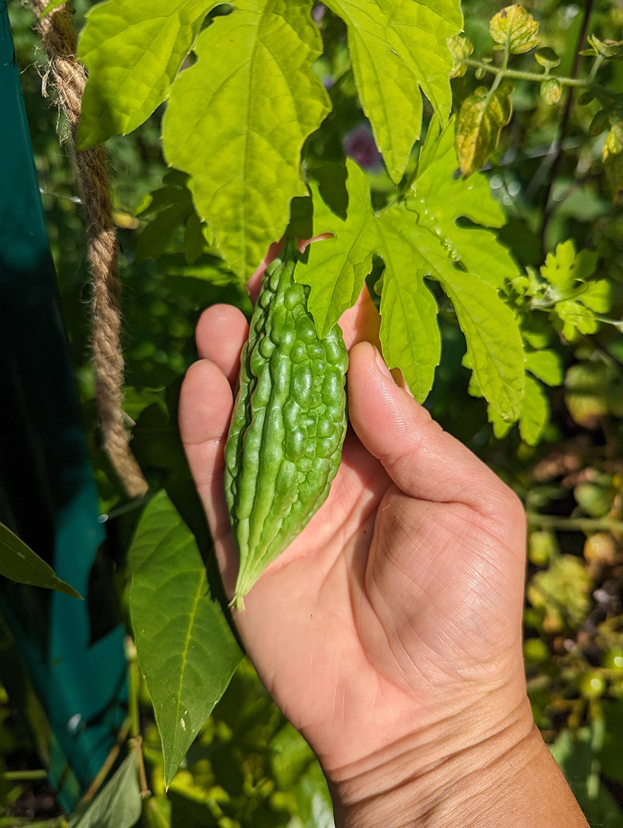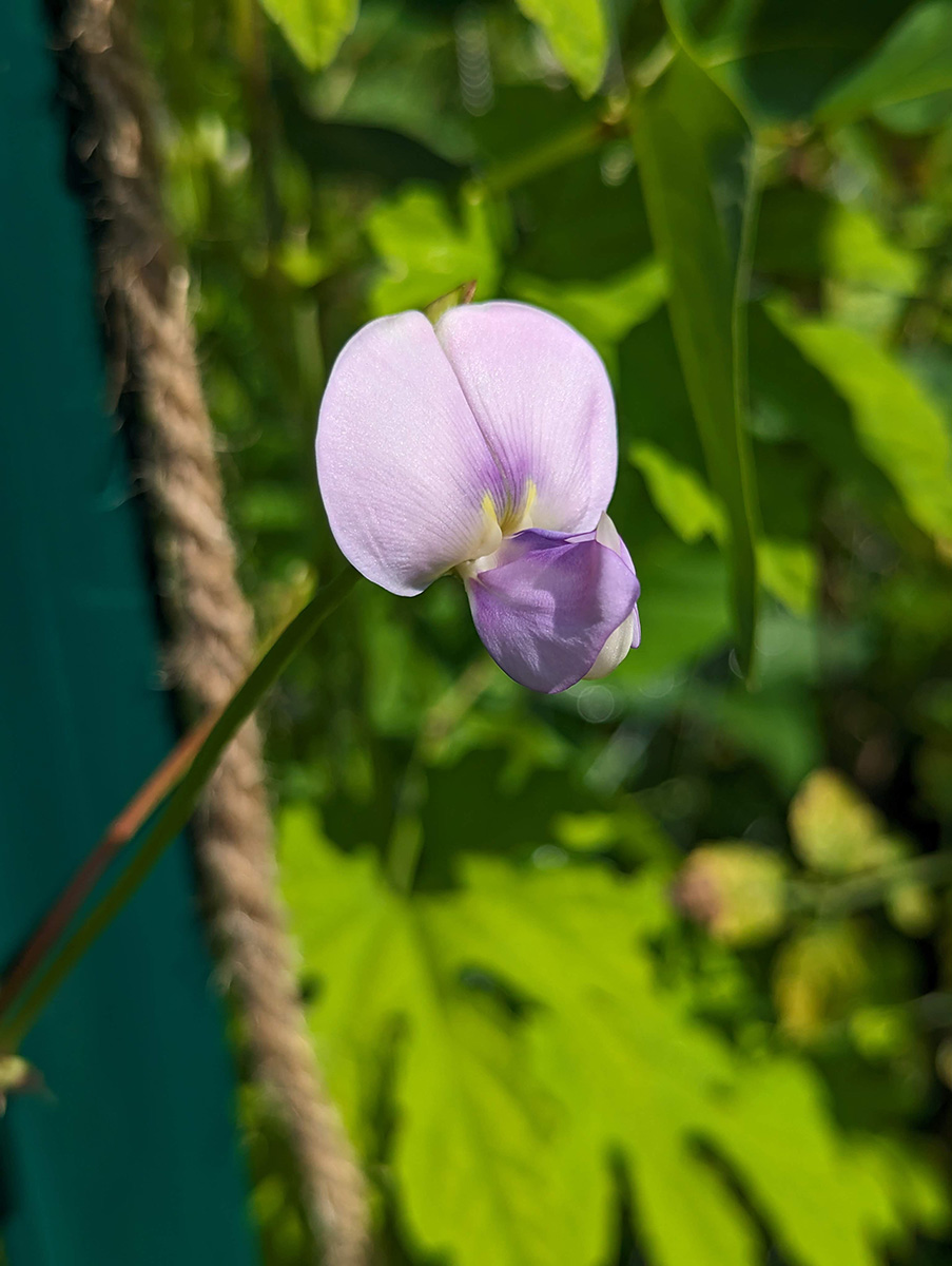 the reason why i got up so early to run was because ann contacted yesterday about needing help pounding in some wooden stakes in her garden. we scheduled to meet at 10am. i got there right on time, but ann as always was late, and texted me she'd be there in 15 minutes. it gave me time to check on my own garden, water some plants, pull up a few weeds. i saw a long bean flower for the very first time this season. they remind me of a cartoon pluto, or the inflated head of a balloon animal. definitely doesn't look like any of the bean flowers we've been having in belmont, still a mystery why we haven't seen any long beans even though i over planted long bean seeds.
