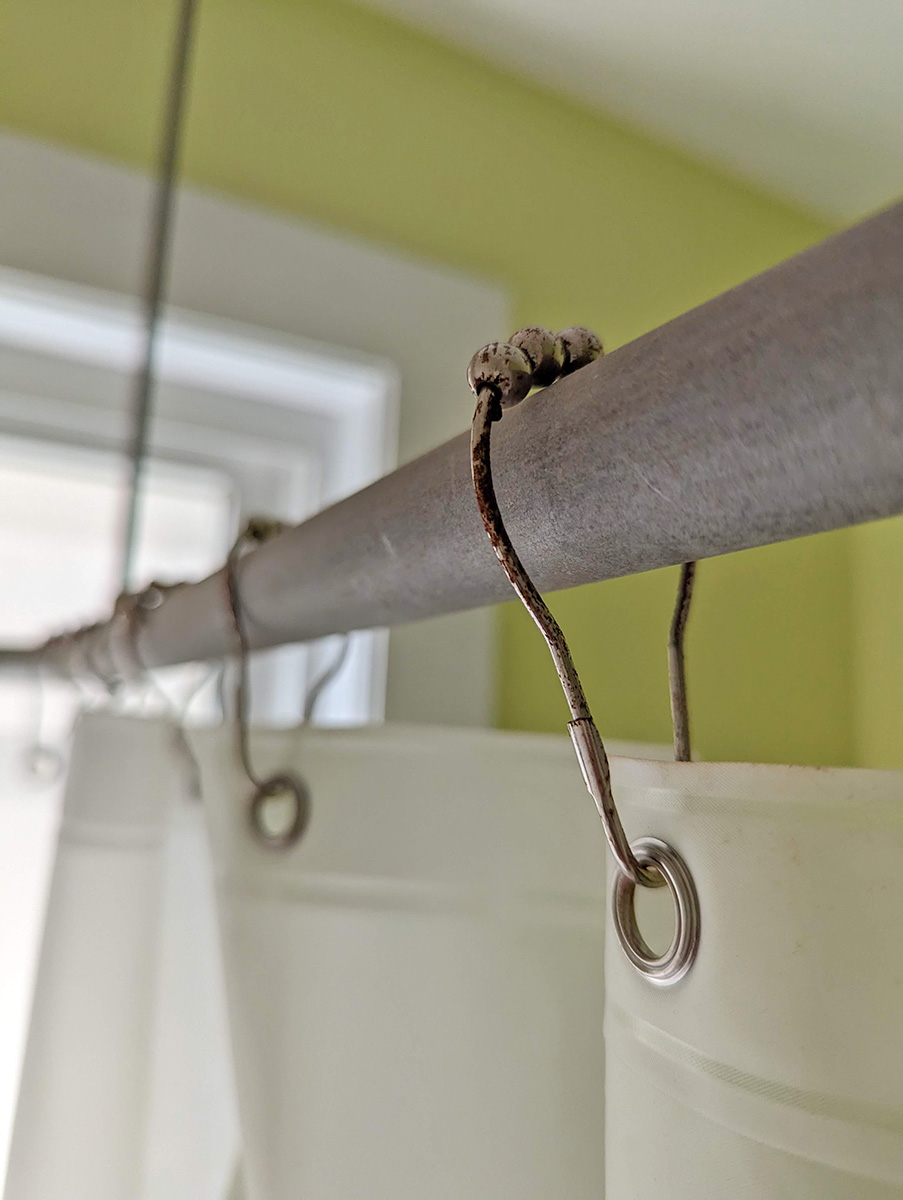 i finally returned home by 11am, used the bathroom, showered. i noticed today that my seemingly rustproof stainless steel shower curtain rings were all covered in rust. contrary to popular belief, cheap stainless steel will rust under wet conditions, which what was happening here.