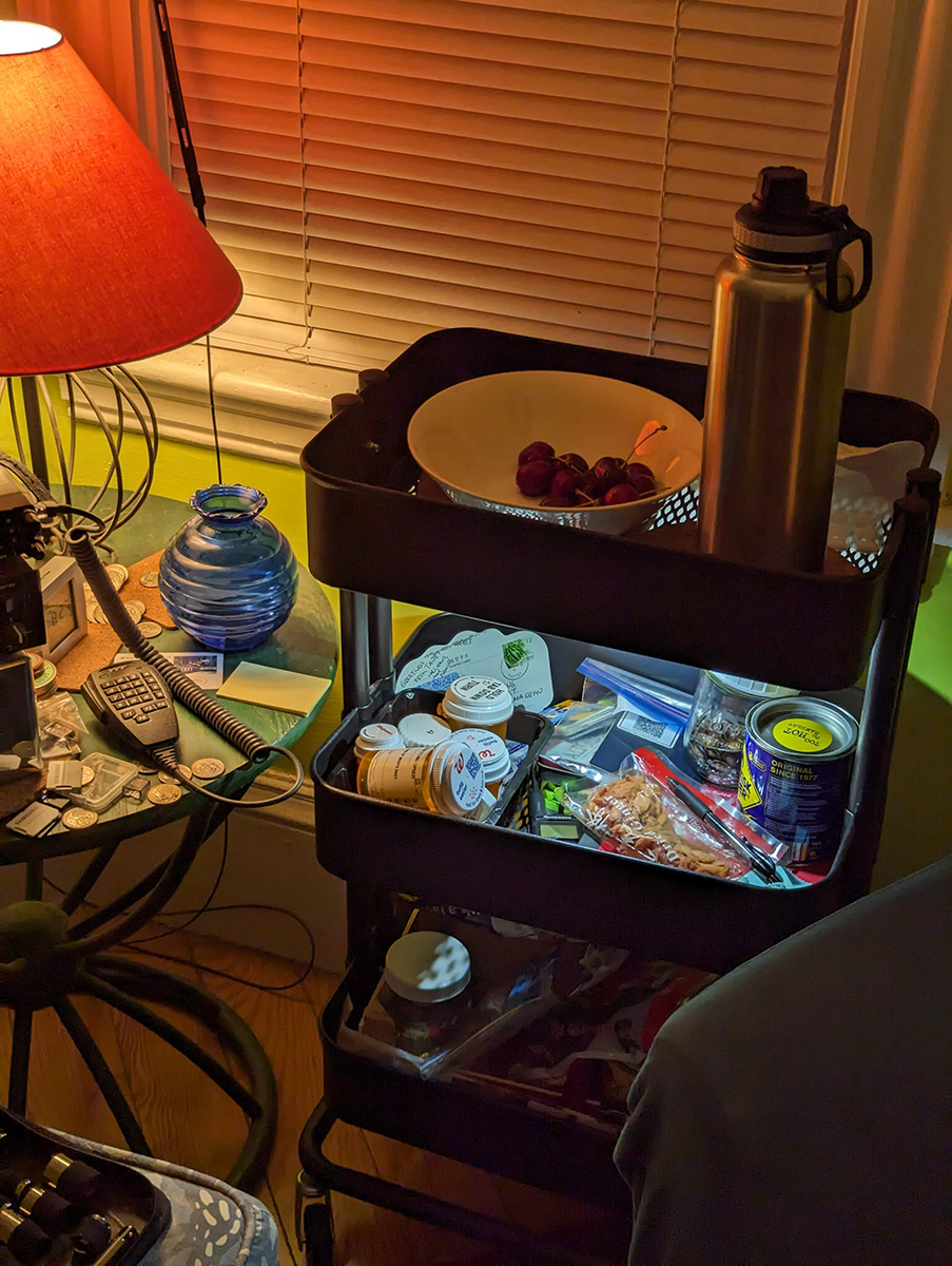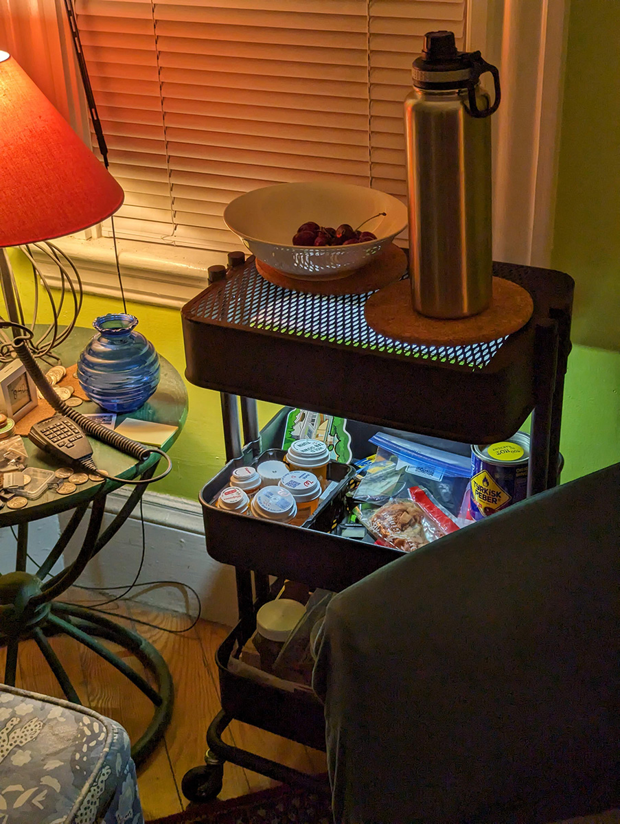 i decided to hack my found ikea råskog utility cart by flipping the top basket upside down so it becomes a table instead. i've found that i often hit the side of the top basket when i reach for my bottled water or bowl of snacks. this is just a temporary solution, until i can get a wooden board (the HÖGSMA $12) to place on top of the basket to make a functioning table. the bottom of the basket wasn't exactly flat, so i had to press it down into shape.