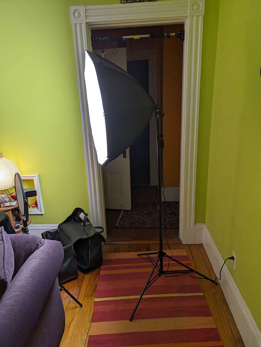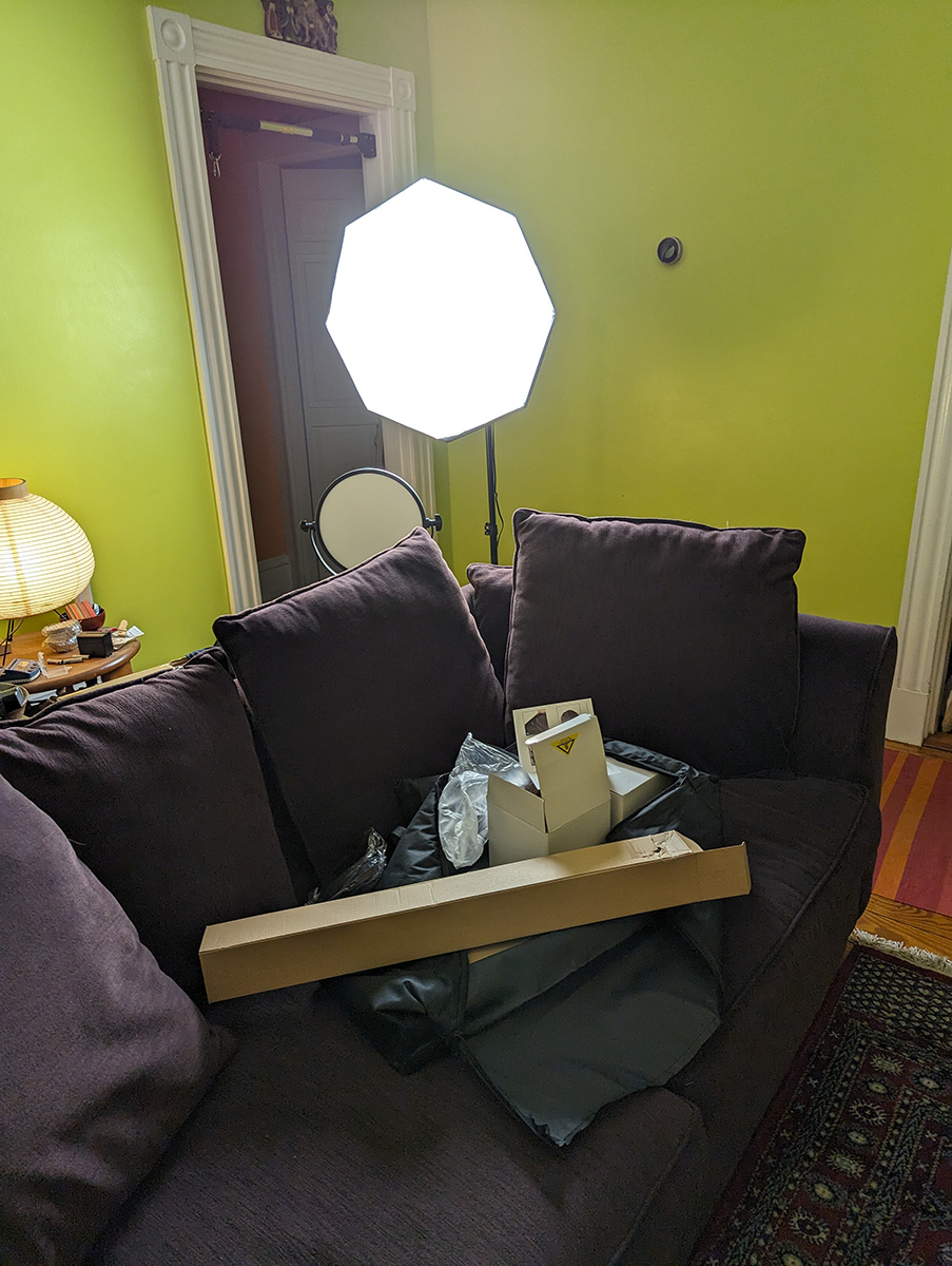 i finally tried my octo softbox lighting kit. i'd examined it briefly when it first arrived a few weeks ago, i remember thinking the quality was a bit cheap, and might end up returning it. i only set up one light just to try it out. yes, quality-wise it's a bit cheap (vinyl instead of cloth, and a plasticky smell), but not bad for $77 (amazon prime special). the light is super bright (135W LED) and can be controlled by a remote, adjusting the brightness and color (2700-6400K). it'll set up the other light tomorrow and do some test photos. just with one softbox, i did some quick self-portait with the phone and the lighting made it look like it was taken during daylight. i think it'll keep it after all.