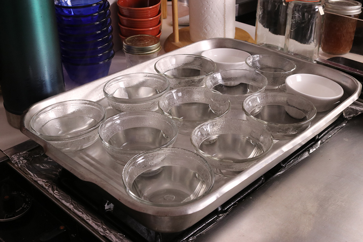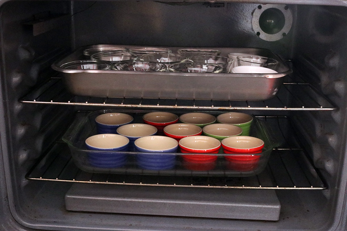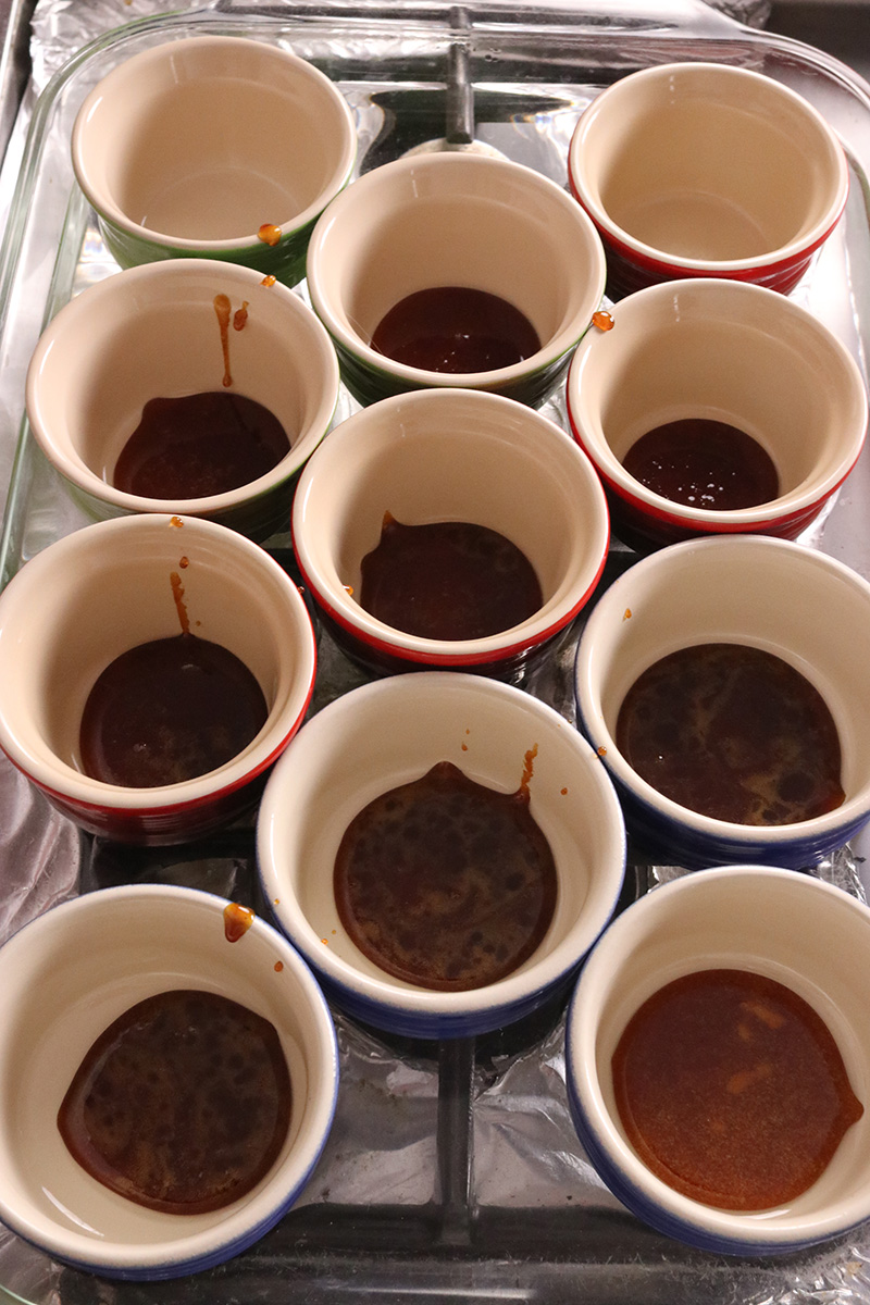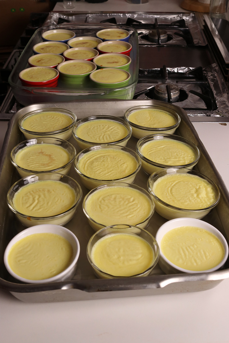 making flan is actually dangerous. first there's the hot water bath. then there's the melting of the sugar and pouring them into the ramekins. finally i need to put the two baking dishes into the oven, and swap out the dishes at the midway point. all opportunities to burn myself, whether its from boiling water, molten sugar, or the hot interior of the oven.