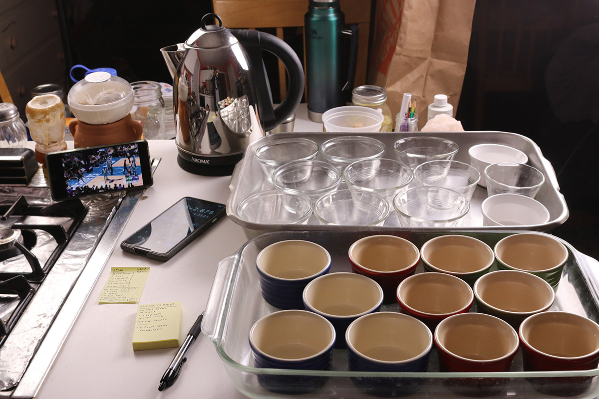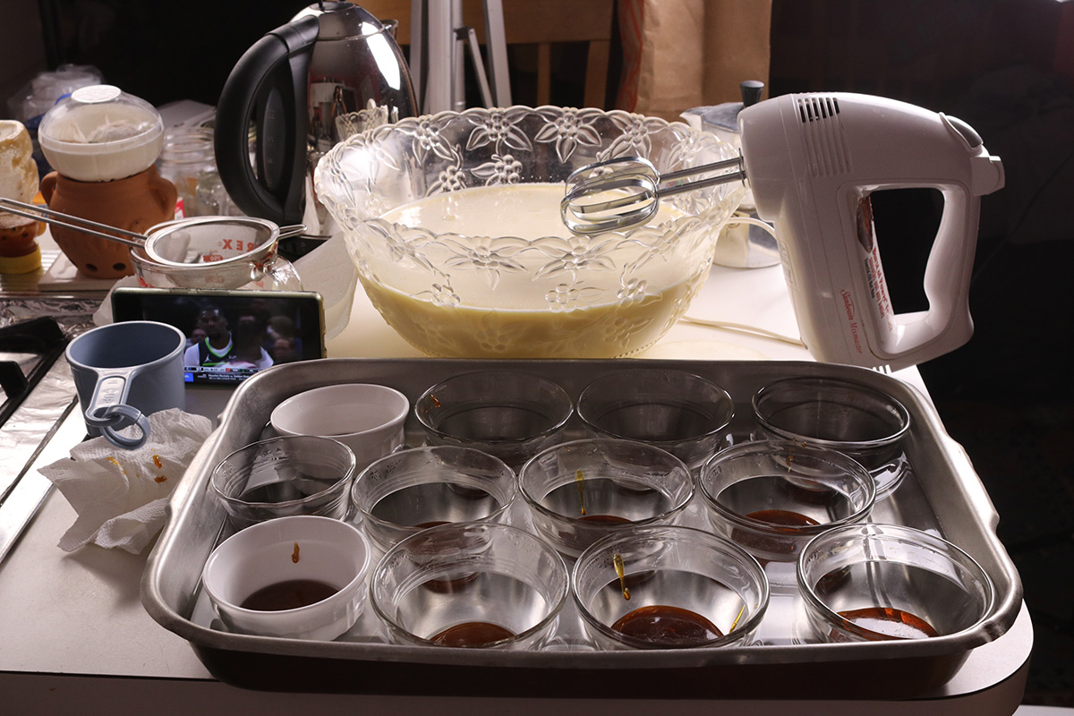 reunited with my glass ramekins, i could finally start making my flan. unfortunately i was too engrossed in the celtics-hornets game, and i didn't get cooking until after halftime around 9pm.