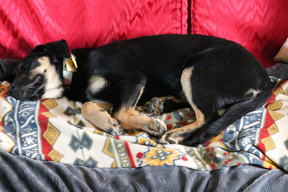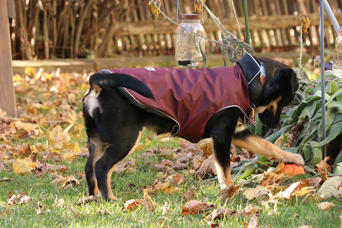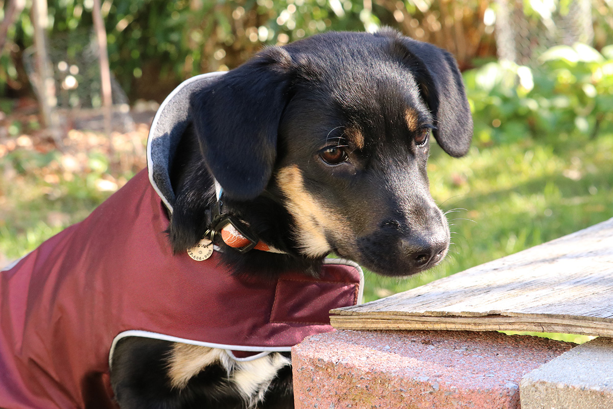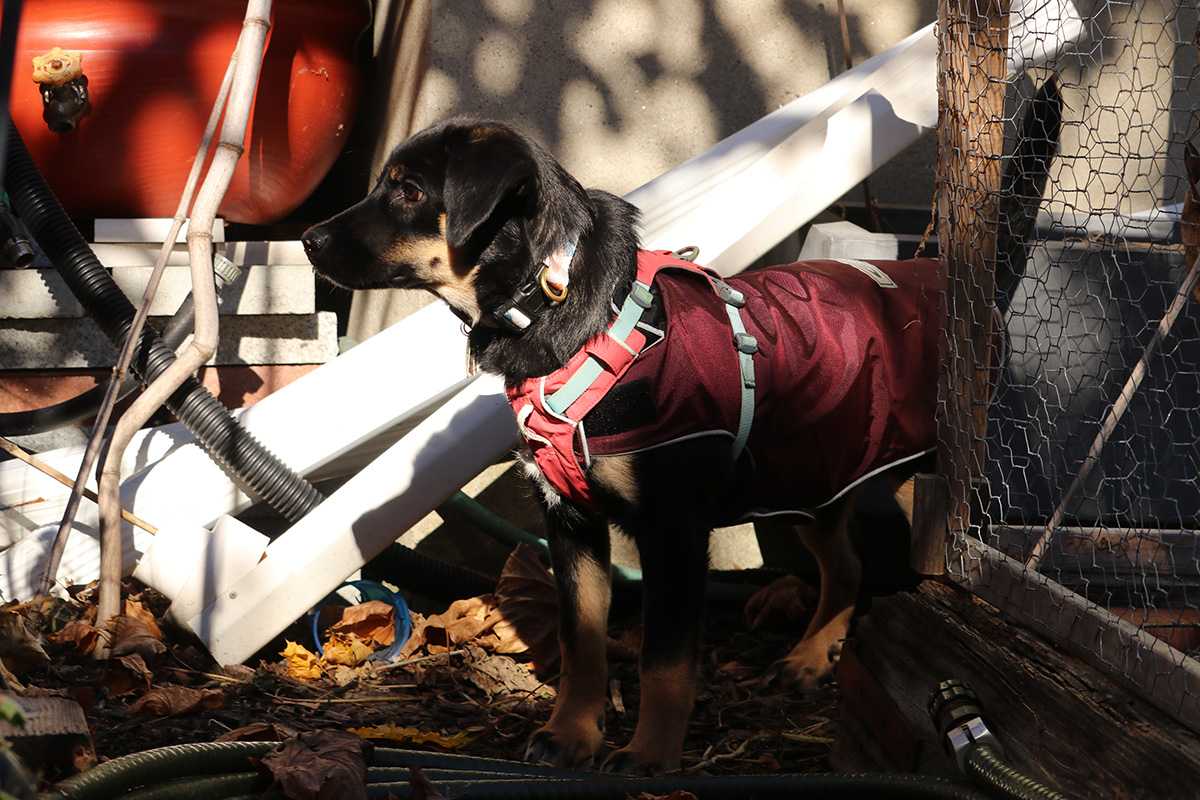 my sister was already at my parents' place with esmei when we got to belmont. esmei was sporting a purple fleece-lined dog cape. i followed here everywhere she went around the house, seemingly investigating everything. i forget that everything to her is new, but i also think she was just searching for things to eat or chew, like power cords or in my mother's case, balls of yarn. at one point esmei saw a mirror and spent some time looking at the other dog in the mirror. she wasn't aggressive nor was she overly curious, but she definitely saw something.