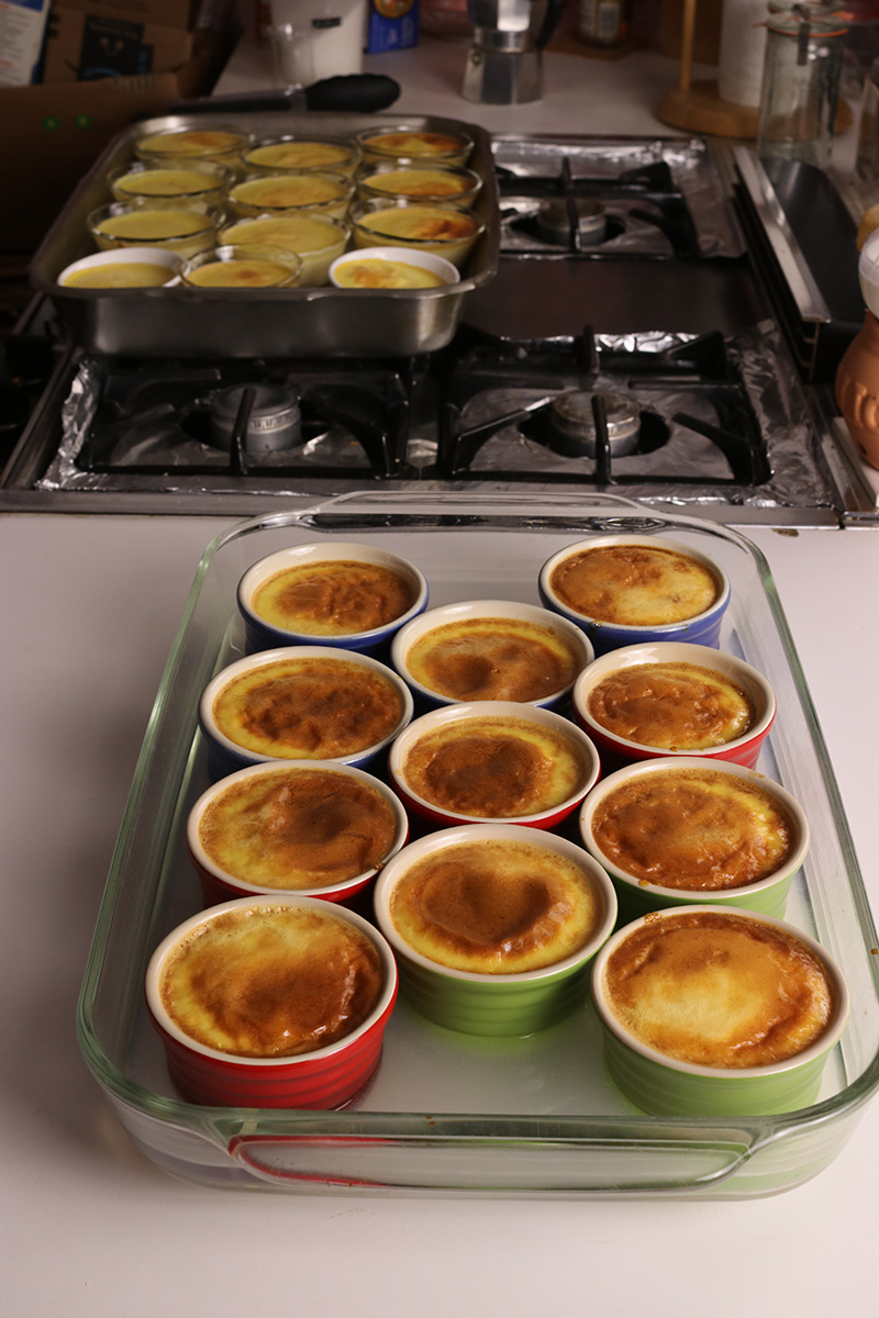 around 10:30pm the flan went into the oven. it took 2 hours to finish baking, filling the house with a sweet eggy smell, like being inside a pastry store. the ceramic ramekin flans came out golden brown because they were on the top rack during the 2nd hour of baking. no one sees this layer anyway though because it's actually the bottom of the flan when you invert it to serve. but there's something satisfying about seeing a brown "top" on a flan.