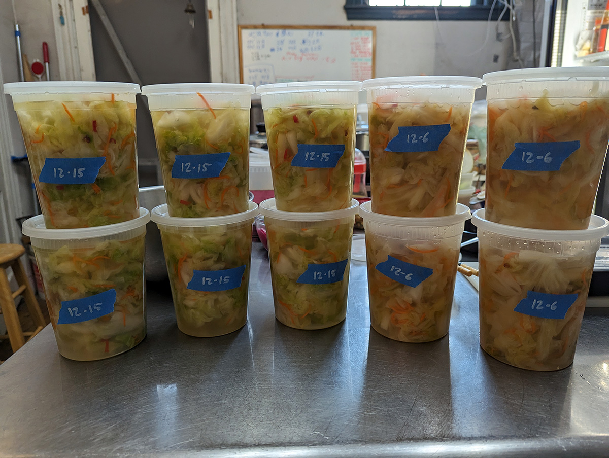 it wasn't too busy today at the cafe. the nearby private school already started their winter break, and harvard begins theirs late next week, and students won't be back until 3 weeks later. a lot of regular customers though, including a woman who's ordered every single day this week. that gave me time to make another batch of taiwanese paocai. i made 7 containers (12 lbs. of cabbage) 1-1/2 weeks ago, but that big 40 bento order we got last week used up 2 containers. making extra isn't a big deal, the stuff keeps well, and it's actually better if it has time to age for a few weeks, the cabbage turns a pale color. i bought 3 heads of cabbage from chinatown yesterday totally 10-1/2 lbs. that was enough to make 6 containers. it took a total of 4 hours to make, from chopping to reducing and finally pickling and packaging.