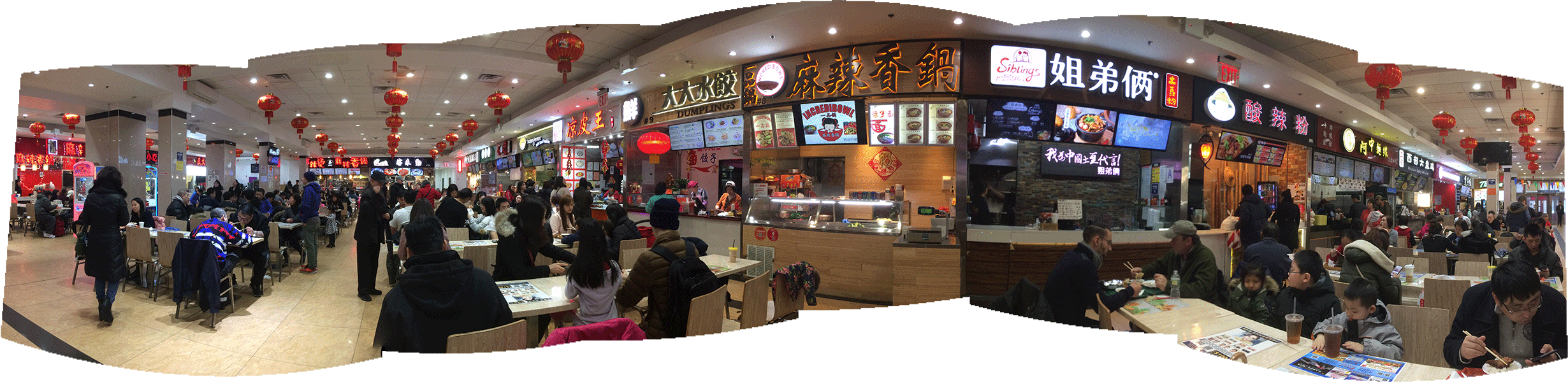 when we got out at flushing it'd started to rain a little bit already. this was in the forecast and something i knew about. but i was the only the person with an umbrella, everyone else putting their confidence in their rain-resistant jackets. i ended up giving the umbrella to hans to use in his wheelchair. another thing i'd forgotten about flushing is how close it is to the la guardia airport. every few minutes a main would roar overhead, close enough to see passengers through the windows if it weren't for all the clouds. in the cold rain, the time it took us to walk 500 meters seemed like forever, but eventually we arrived at the new york food court by 1pm.
