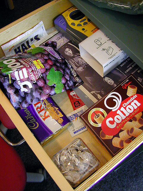 at work i'm starting to amass a small stash of food. this has attracted all sorts of interesting office denizens who come by my work area foraging for sustenance. there's actually a lot of food in the office, if you know where to look and who to ask. there's always food in the fridge, but one never knows who it might belong to.