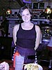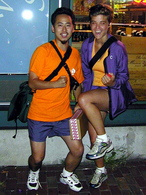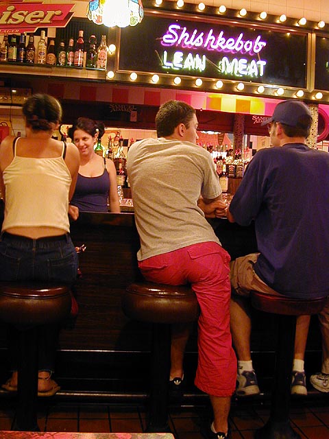 after the cellar, everyone headed in the direction of harvard square in the quest for food. klea and rebecca made fun of my short running shorts, and i used the ibook memory box i was holding to cover myself up. hong kong restaurant was a final resort option, which fortunately we didn't have to take. when we got to harvard station, jared, rebecca, and julie all went home while i was stuck with the two drunkards (david and klea) in our continuing search for something to eat. the three of us ended up at charlie's kitchen, where david's sister-in-law kimberly was working her last night as a waitress in that restaurant. david and klea both had burgers, while i, still full from kelly's roast beef, opted for the homemade rice pudding, which turned out to be sort of nasty and not like any rice pudding i've ever eaten before (more like potato chunk pudding). at the bar right opposite our table sat a man wearing red pants. can this night get any better? i should've asked him where he got his. in the restaurant there were television monitors tuned in to some destiny's child concert film. for much of the time i was there, i was gawking at the television, mouth agape, mesmerized by beyonces, one of the sexiest women i have ever seen. can this night get any better?