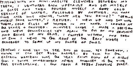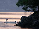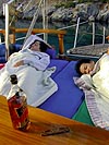 as the sun slowly crept up from the horizon to bring light to another day, i watched one of the crewmembers get on the speedboat and motor off to this remote area by the shoreline to catch some fish with a net. the previous day the same guy got dressed in a wet suit and went hunting for fish armed with a speargun. he didn't catch anything, so i think that's why he was up so early fishing (besides the fact that maybe there are more fish right at dawn). around that time ayse and dave woke from their outdoor beauty sleep.