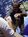 after breakfast we sailed to a different location (site 3), situated next to some underwater ruins no older than a hundred years old at most. we took the speedboat to the site and got into the water to do some exploring. the walls of the rooms were made from stones, and the ground below was covered in sea grass. after our exploration, we all swam the 500 yards back to the ship. i of course was decked out in my life preserver and fins, and basically just paddled backwards effortlessly on my back for the return trip.