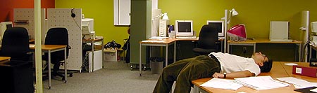the later it gets in the office, the crazier i become. i get a little of that cabin fever (oh, that's what you call it? i just thought you were psycho!), cooped up in the building for most of the day. and of course that bit of coffee i had many hours ago didn't help matters out very much either. i was playing the smiths, singing outloud ("girl-friend in a co-ma, i know i know, it's se-ri-ous!"), getting into my programanista groove, i even fashioned a zoob crown. i based it the pope's hat, a samurai helmet, and an insect head. i got totally busted for it though, not once, but twice. a secret admirer aim'ed me to express his love for my crown as seen via the live webcam (busted!), and paula and her brother saw me in my inappropriate state when she returned to the office after amy's celebration.