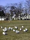 on my way home, the 1000 yards from where the bus drops me off to where i live, i cut through a park, where i spotted a gathering of ring-billed gulls resting. i snapped some photos, and then suddenly they all flew away, almost an reenactment of some deadly scene from the hitchcock movie the bird. i'm not as afraid of getting my eyes pecked out as i am about these flying creatures pooping on me. i admit, i have a fear of getting pooped on. by birds.