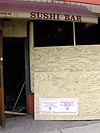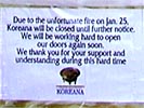 hastily applied plywood panels covered up the windows but you could still see deep inside, all black and charred. a bilingual sign taped outside told how the place burned down just three days ago and how they were looking to rebuild as soon as possible.