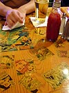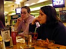 four ceiling mounted television screens where in the background and i had a hard time concentrating on the conversations, occasionally my attention drifting to inside edition and extra. i had a root beer and a serving of large fries. it was almost impossible to get the ketchup to come out of the bottle, and i had to poke at it with a straw and french fries. elias and i left an hour later along with christine. while christine went home, we went to central square to go to the people's republik.