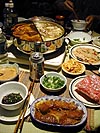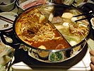 my aunt and uncle and my 2nd aunt came over tonight for some family hot pot action. the special occasions were the belated celebration of my father's and aunt's birthday (february 8th, which was when this dinner was originally scheduled for), my own natal anniversary, which also happened to be the same day as the chinese new year as well. tonight we tried something new, spicy mah-lah ("numbingly hot") hot pot. we even got a special pot for the occasion, one that was sectioned into halves so one side could be hot and spicy while the other side just normal. (btw, that's a conduction heating platform we're using).