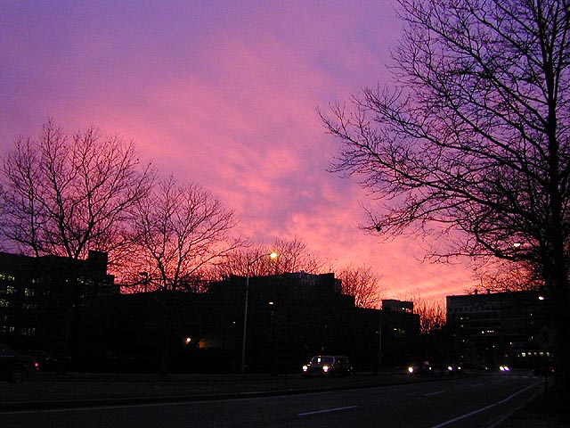 close to the end of the normal work day i burned off a cd and raced it downstairs for testing before we'd ship it out. i noticed both elias and rob where no longer there, their brief contracts finally came to a close. they didn't even come up and say good bye before they left! going back upstairs once more to wait for the verdict (before i burn out the rest), i saw a very pretty sunset in the western horizon while walking around the building. i stood outside for a few minutes admiring the colors.