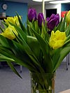 first thing that happened when i got to work was eliza sent me some birthday well wishes via aim. though she was the first (of many) in the office to do so, the very first person to wish me a happy birthday was actually joel the night before, online right before i went to bed. throughout the day people (friends and family) would either aim or e-mail me with their birthday greetings. about an hour or so into the work day, a group of delegates from downstairs came up bearing balloons and flowers. i was surprised, embarassed, and happy all at the same time. there was some singing but i didn't hear it because i was sort of overwhelmed at suddenly being thrusted into the center of attention. i also felt sad. it wasn't anything about getting old, but i was sad because i couldn't really enjoy it, i had to stay focused for work, can't be sucked into the intoxicating fervor of my special day. with a delivery due, i didn't have time to stop and soak up the excitement.