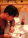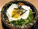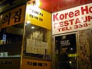 usually that's a good sign that it's an authentic restaurant, but in this case it just made me nervous, like we didn't belong. the place kind of reminded me of a gangster restaurant, how only connected people would eat there. there was a sleazy quality to the place, one entire wall completely covered in korean and english graffiti, felt like i was having dinner in a bathroom stall. there was also a nasty smell of fermented beans. however, the service was excellent. apparently the manager was waiting tables tonight. dan and i both got the bi bim bap served in a stone bowl for $3 more. i was joking around about the hard sell restauranteer, "you have to get the bi bim bap on the stone bowl! if you don't get it, i don't we can serve you. get out!" how if i had a restaurant, i would totally talk people into getting things they didn't want just because it was more expensive, sort of like a car dealer. when we got out bi bim bap, the manager came over and said we were eating it all wrong and proceded to show us by mixing together everything in dan's stone bowl. the hard sell! in my mind i was imagining, "you don't know how to eat it! get out of here! i can't sell to you!" bi bim bap was okay, but for my money, i would've prefered something spicier and a lot less rice. i'm not big on rice. i'm a noodles man myself.