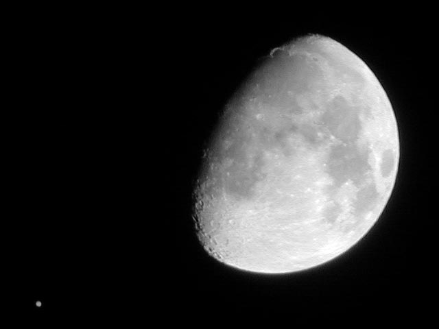 stepping off the bus i noticed the moon was right next to the bright speck of light which i knew to be jupiter. when i got home i grabbed my telephoto lens and my tripod and headed out into the backyard to get some sweet moon-to-jupiter action. i thought maybe the moon would completely eclipse jupiter, but after consulting with my starry night astronomy program, it seemed to be a near miss (except for europeans, who will see the moon block out jupiter).