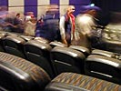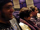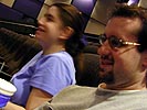 soon afterwards elias and his two friends marisa and mike showed up, and we all got our tickets stubbed and went in to stand in a disorganized mob of fans waiting for the screening room door to be opened. melissa, who has the hookup, got us in before everyone else showed up and we get the best seats in the house. the theatre people were still cleaning out the place when we sat down. when they finished, they let all the other suckers in as we watched them spread out to find the best possible remaining seats. prior to the movie starting, they were handing out prizes to people who can either answer certain trivia questions or could perhaps certain physical stunts.