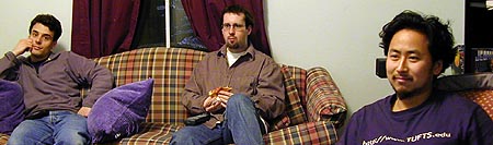 around 7pm i went over to dan's place after he called me up to let me know that john was back in town and they were going to rent bad movies to watch. on the way there, i totally busted this girl who was checking me out from her car. she sort of turned to look at me, and i turned to look at her, and she quickly turned away kind of embarassed, which got me to smile. is it the hair? who knows. when i got to dan's apartment, brian and his two friends morgan and peter were there. everyone was watching real world chicago. morgan, who seemed pretty quiet when i first saw him, after a few minutes started chastising dan and i for being nonproductive breeders, how we should be out on a saturday night cruising for chicks instead of sitting at home, and how we were kind of sad. brian even took a photo of the tongue lashing with a little disposable camera. nothing like being chewed out by a gay man to really livens up the evening! after brian took his friends out for the night,