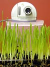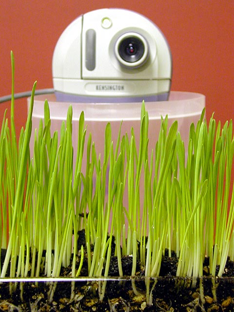 it took just one weekend for my cat grass to transform from a few sprouts poking out of the dirt to a full fledge green garden! i wasn't optimistic my cat grass experiment would do so well, sitting on the windowsill in the shade, but apparently for some unknown reason the conditions upstairs are just ripe for plant growth (at least for cat grass), and when i got to the office this morning i was absolutely amazed at how much the grass had grown. after giving it a nice drink of water in the kitchen sink, i brought it to my desk and put it in front of my office webcam. as the days go by, you'll be able to see the grass slowly inching their way higher and higher! come watch grass grow!