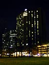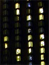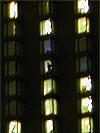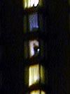 when we got back to the office, i didn't even bother showering, i changed my clothes and left (with paula, who walked with me briefly). walking down the sixth street path i noticed some sort of commotion happening below the marriott hotel, a bunch of firetrucks with their spinning siren lights parked along broadway street. i looked up at the building and saw a column of windows where the lights inside were flashing on and off in a sequence. it was pretty wild. (in the photos below, it's the second column of windows from the right side, it was blinking in a sequence, like a cascading light show. i'm zooming into a man standing at a window watching the activity down below).