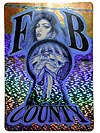 coming out of the supermarket, i had some change so i decided to get a sticker from this one particular vending machine that was selling images of the virgin mary, jesus christ, and hotrods. off in the distance i heard amanda mutter something about how immature i was. the sticker i got was a really weird one. the background was this repeating holographic pattern, it had the words "f b county", a photo of a woman, and a picture of a man (handlebar moustache, dark glasses, convict?) sitting on a large 8 ball shackled to a leg in what appeared to be in jail, all inside of a keyhole frame (further emphasizing encarceration). in one corner are some text that read © 1998 sleepy "g" and on the back it said "made in taiwan." the whole sticker - its symbolism and hidden meaning - are all quite interesting. what does it all mean i wonder? and is this the kind of thing that little kids would be interested in collecting?