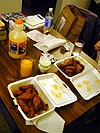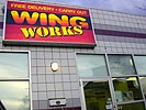 when i got home i checked the answering machine and there was a message from manny asking me if i was interested in having wings tonight. this was an opportunity to finally get something to eat. i called him up and drove down to his place in medford, where we then went down to wing works to pick up our 24 pieces of medium wings along with a side order of onion rings.