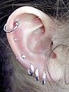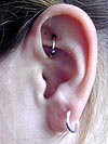 this ear cartilage piercing passes through the upper inner cartilage fold. to many people's surprise, this is one of the more painful piercings. |