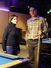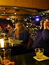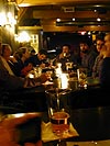 so we got to the 608 and saw a young woman standing outside the establishment. "they don't open up until 8pm," she said to us as we rattled the door. we stood outside in the drizzle for a few seconds. "you're not here for the boston blogs, are you?" she asked. turns out this was sooz, one of the organizers of the event. after some more waiting, they let us inside, where elias and i met shannon, the 2nd half of the organizing duo. slowly over time people started filtering in. lee and rebecca (different rebecca, not ketcham), then susan, then more and more people whom i wasn't formally introduced to and who sat at the other end of the table, thereby making that "getting to know you" action sort of impossible. the conversation wasn't as awkward as i would've imagined it to be, despite the fact that the only things we had in common were we live in the boston area and we have weblogs. some people were able to match the face or the name with a list of weblog url's sent out prior to this gathering tonight. working from home euphemism, hiakus, gadgets, choice of drinks, all were discussed. rebecca entertained us further by making obscene drawings in shannon's palm pilot. rebecca and i also discovered we live fairly close to one another, she in watertown, me in belmont, and she raved about this one donut store that i see every single day that i commute to work but have never gone in and visited.