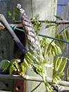 wisteria: a few years ago we planted a wisteria vine in the garden and every season while we watched wisterias in other gardens bloom in lavish strands of grapelike purple flowers, our own wisteria never never bothered to produce a single blossom - until now that is. today i noticed a single bud sprouting from one of the tendrils. unfortunately, that was the only one i saw, but it's a good sign, and maybe next year there might be a few more.