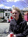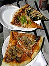 i was surprised when eliza suggested we get truck food. the truck food is as cheap a lunch as they come, but they're notoriously unhealthy, or so say the general consensus. while waiting in line to get truck pizza, i asked eliza about her sudden change of heart, why this renewed interest in truck eating, since i equate eliza with healthy food. i was hoping the answer would be, "because i just want to go wild today," but instead she told me she could still keep her truck food salubrious by going with a pepper or spinach topping.