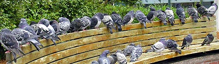 after dim sum i bought some japanese water pears for my mother. we drove back to central square where laurie ditched her car and we took the subway to harvard square, where laurie had to go to work on a sunday that was starting to get rainy. we saw a flock of pigeons all sitting in a row on a park bench, trying to stay dry.