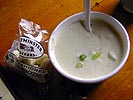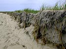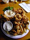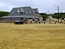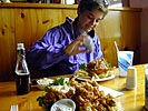 feeling very hungry, we were out to find a good place to have lunch. julie suggested the beachcomber in wellfleet, one of cape cod's few (if not only) beachfront restaurant/clubs. located on cahoon hollow beach (which was also along the cape cod national seashore), we took a little inconspicuous road off of the main highway to get to this place. the parking lot for some reason was full of suvs (i guess they're a favorite mode of transportation amongst the patrons). feeling cold (it was starting to rain slightly when we left chatham), julie and i both had a small cup of clam chowder ($4 each) to warm us up. for the main course, she picked the fish and chips platter, i went with the seasonally priced fried oysters platter