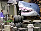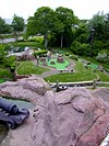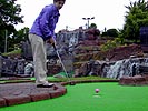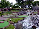 the pirate's cove in south yarmouth (728 main street), for some miniature golf action, which i hear is a staples of good cape cod fun. this would be my first time at miniature golfing. a bit hungry, we got some food in the gift shop (nothing substantial, just dessert food), i got a large blue slush puppy, julie went with some ice cream and a bag of cape cod potato chips. back on the main course, the admission was $7 per person, julie picked a pink ball, i went with red. the golf theme of pirate's cove is of course piracy, the sailing kind, and throughout the elaborately decorated multileveled course (with many waterfalls and rivers), there were replica pirate booties, pirate graves, pirate ships, pirate hideouts, and the occasional animatronic talking pirate spewing out good old fashion pirate talk.