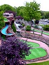 a half submerged galleon would occasionally fire from its cannon and smoke the whole course. it was surreal, and too bad we could only do one miniature golf course, because along the way we saw some others, and in julie outdated cape cod guidebook, there seemed to be a few more that were even more lavish than pirate's cove. it goes without saying that in the 18 hole course, julie totalling schooled me, but i did get two hole-in-ones versus her single hole-in-one. my problem was i hit the ball way too hard, a few times it ricocheted dangerously close to being permanently lost into the water. i have to work on that soft touch if i am to succeed in the cutthroat world of miniature golfing. the final hole, after you sink the ball, it rolls down a chute and comes out into a bucket by the front desk (for eventual recycling).